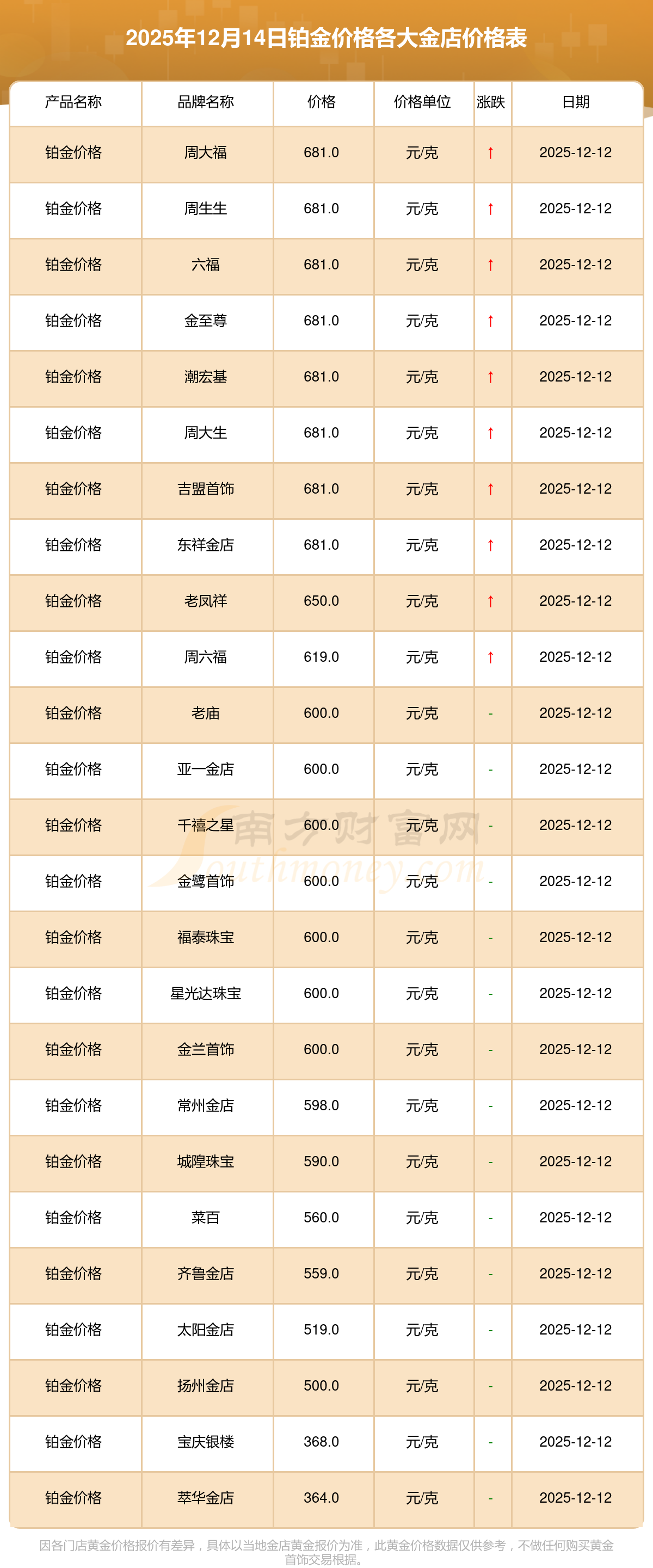 2025年12月14日各大金店铂金价格最新价格:周大福1336.0元/克,周大福681.0元/克,老凤祥1337.0元/克,老凤祥650.0元/克,老庙1339.0元/克,老庙600.0元/克,周生生1338.0元/克,周生生681.0元/克,周大福1336.0元/克,周大福47410.0,周大福19550.0。