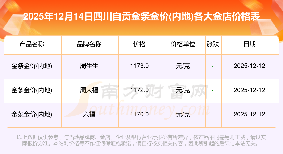 2025年12月14日四川自贡周大福、周大福、老凤祥、老凤祥、老庙、老庙、周生生、周生生、周大福、周大福、周大福等各大金店品牌金条金价(内地)最新价格如下:周大福黄金价格1336.0元/克,周大福铂金价格681.0元/克,老凤祥黄金价格1337.0元/克,老凤祥铂金价格650.0元/克,老庙黄金价格1339.0元/克,老庙铂金价格600.0元/克,周生生黄金价格1338.0元/克,周生生铂金价格681.0元/克,周大福饰品金价(内地)1336.0元/克,周大福黄金饰品(香港)47410.0,周大福铂金价格(香港)19550.0。