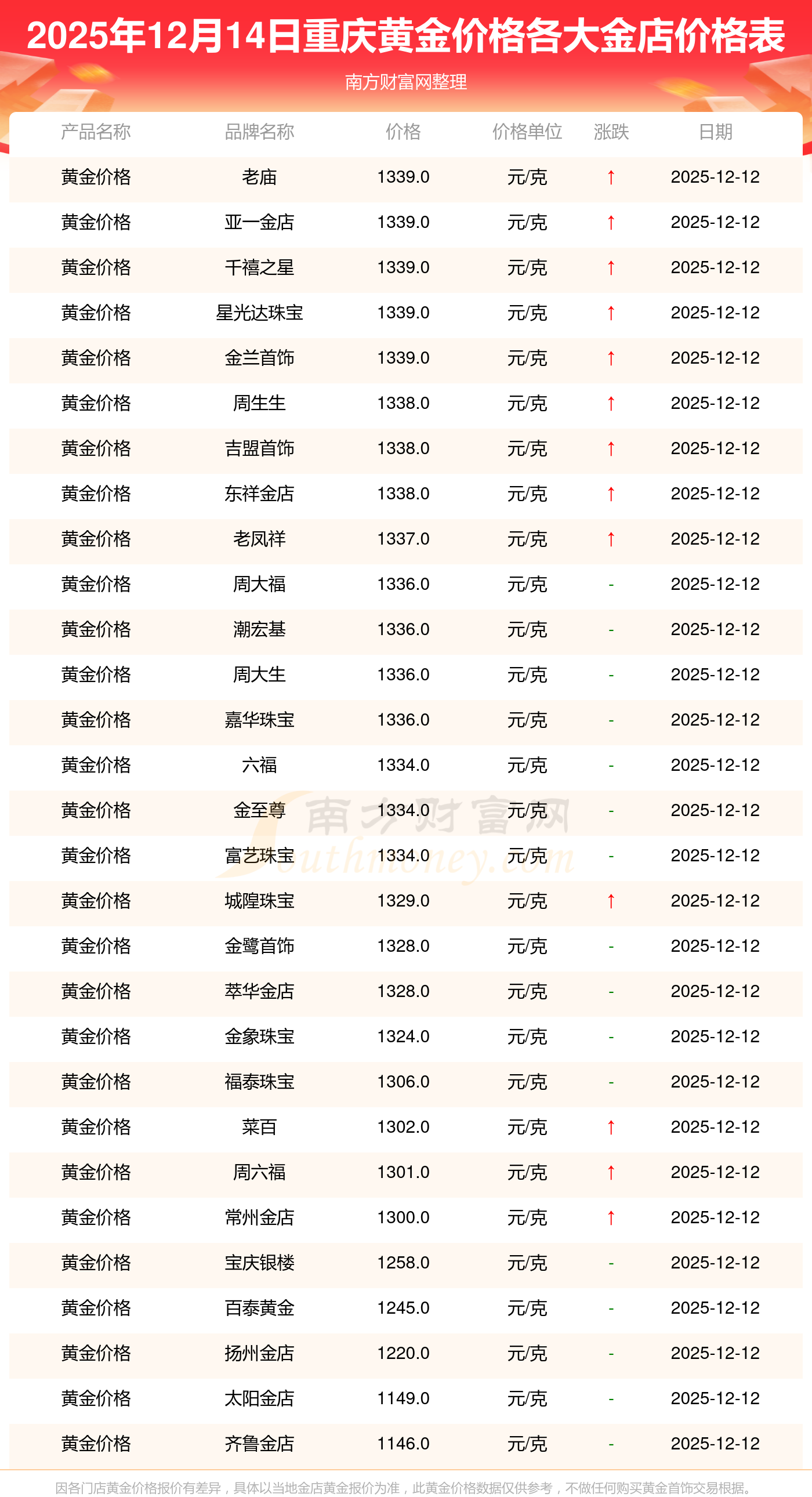 2025年12月14日,重庆周大福、周大福、老凤祥、老凤祥、老庙、老庙、周生生、周生生、周大福、周大福、周大福等各大金店品牌黄金价格今日价格行情最新来了:周大福1336.0元/克、周大福681.0元/克、老凤祥1337.0元/克、老凤祥650.0元/克、老庙1339.0元/克、老庙600.0元/克、周生生1338.0元/克、周生生681.0元/克、周大福1336.0元/克、周大福47410.0、周大福19550.0。