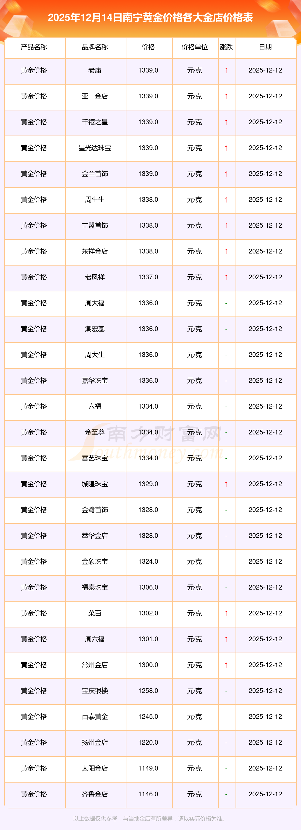 今天是2025年12月14日,南宁周大福、周大福、老凤祥、老凤祥、老庙、老庙、周生生、周生生、周大福、周大福、周大福等各大金店品牌黄金价格最新价格行情是这样的:周大福1336.0元/克、周大福681.0元/克、老凤祥1337.0元/克、老凤祥650.0元/克、老庙1339.0元/克、老庙600.0元/克、周生生1338.0元/克、周生生681.0元/克、周大福1336.0元/克、周大福47410.0、周大福19550.0。