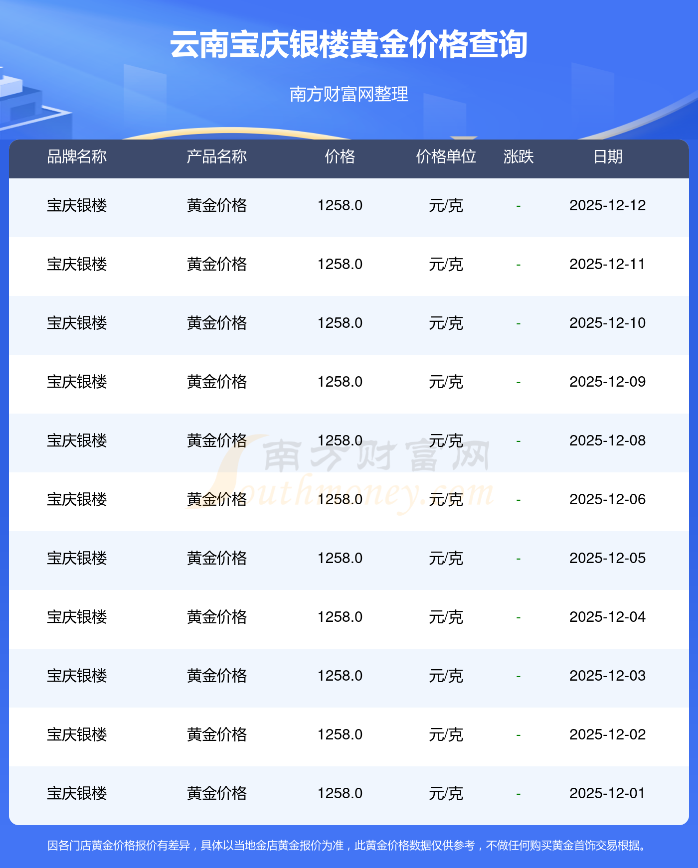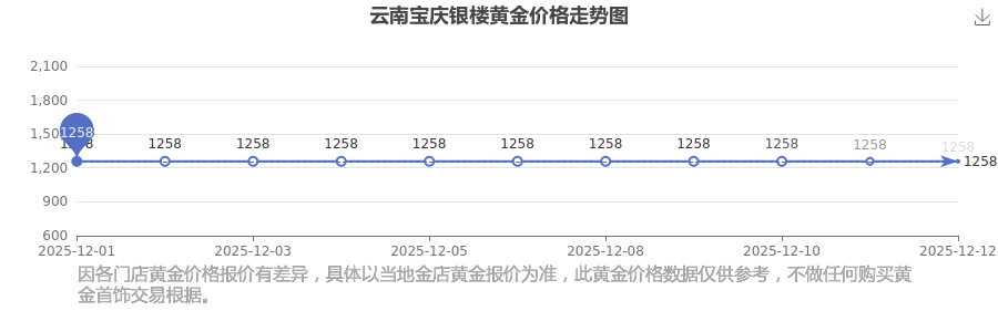2025年12月14日云南宝庆银楼黄金价格:1258.0元/克。