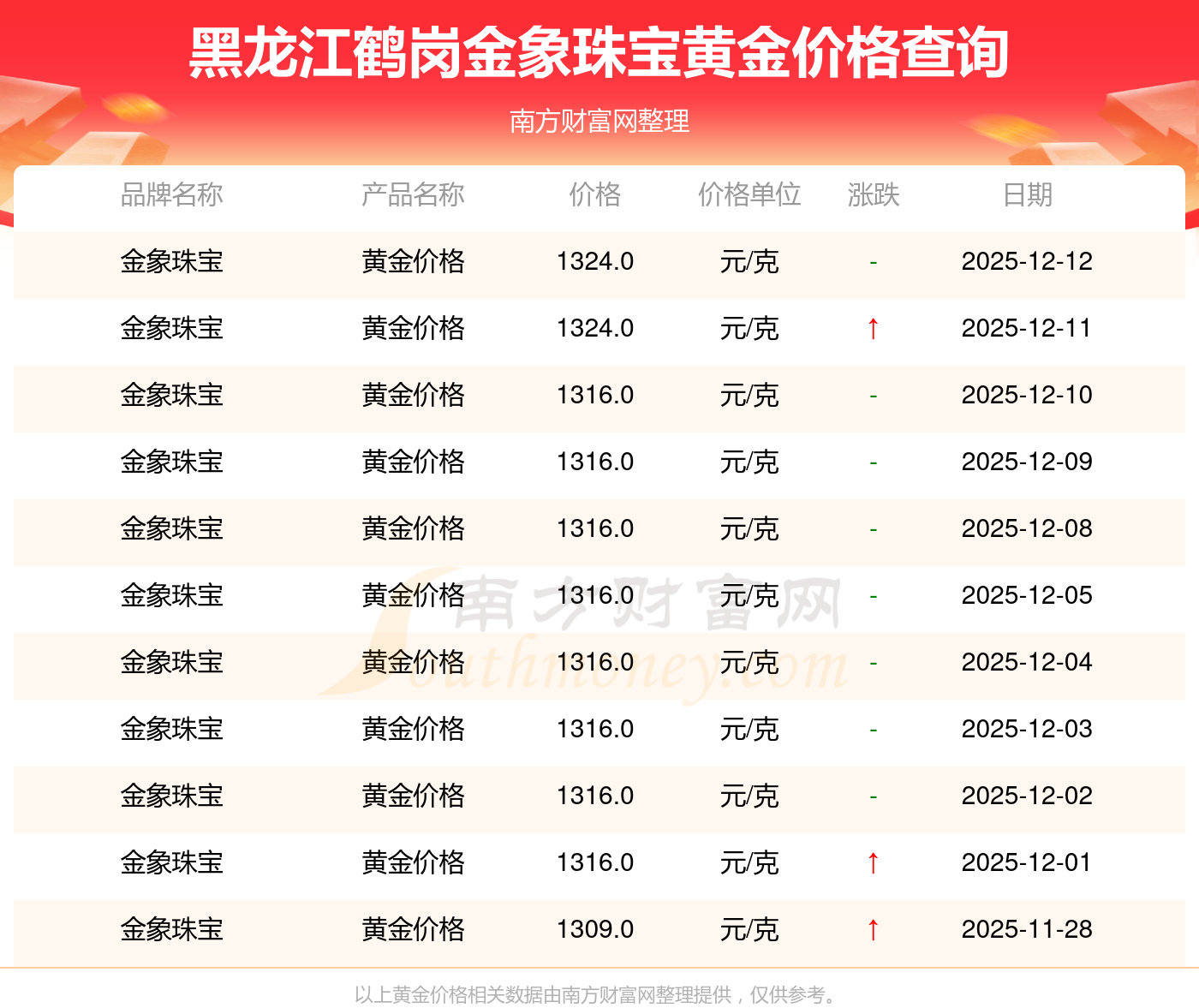 于 2025年12月14日,黑龙江鹤岗金象珠宝黄金价格的克价为1324.0元/克。