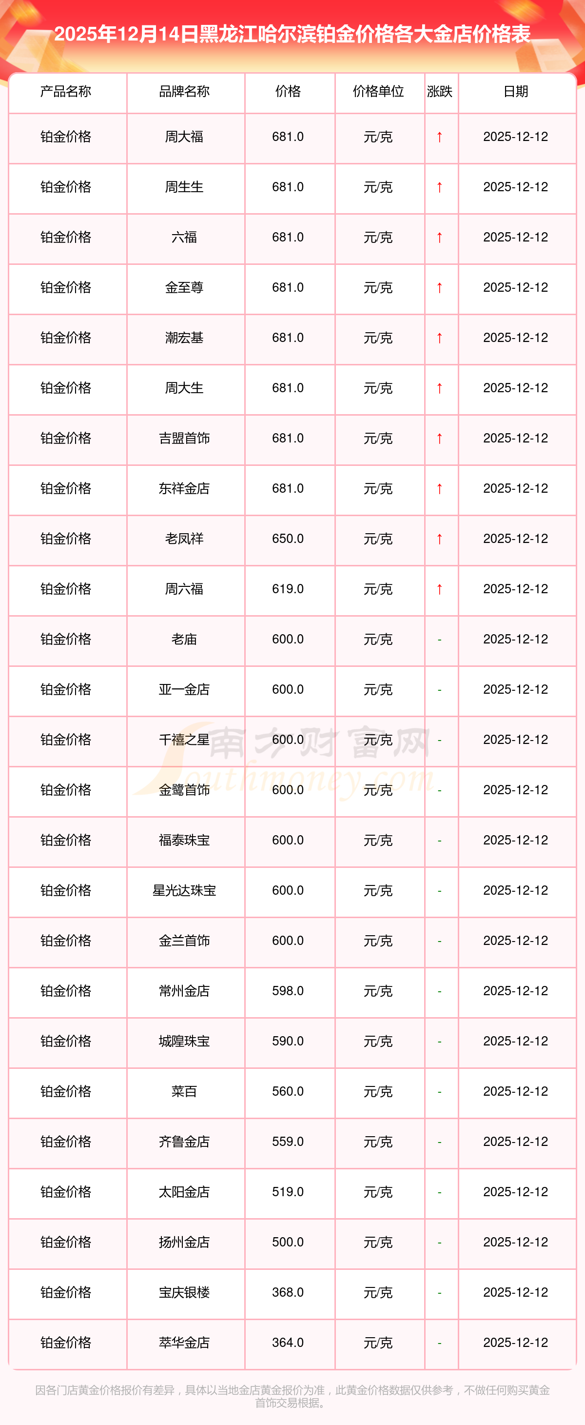 今天是2025年12月14日,黑龙江哈尔滨周大福、周大福、老凤祥、老凤祥、老庙、老庙、周生生、周生生、周大福、周大福、周大福等各大金店品牌铂金价格最新价格如下:周大福1336.0元/克、周大福681.0元/克、老凤祥1337.0元/克、老凤祥650.0元/克、老庙1339.0元/克、老庙600.0元/克、周生生1338.0元/克、周生生681.0元/克、周大福1336.0元/克、周大福47410.0、周大福19550.0。