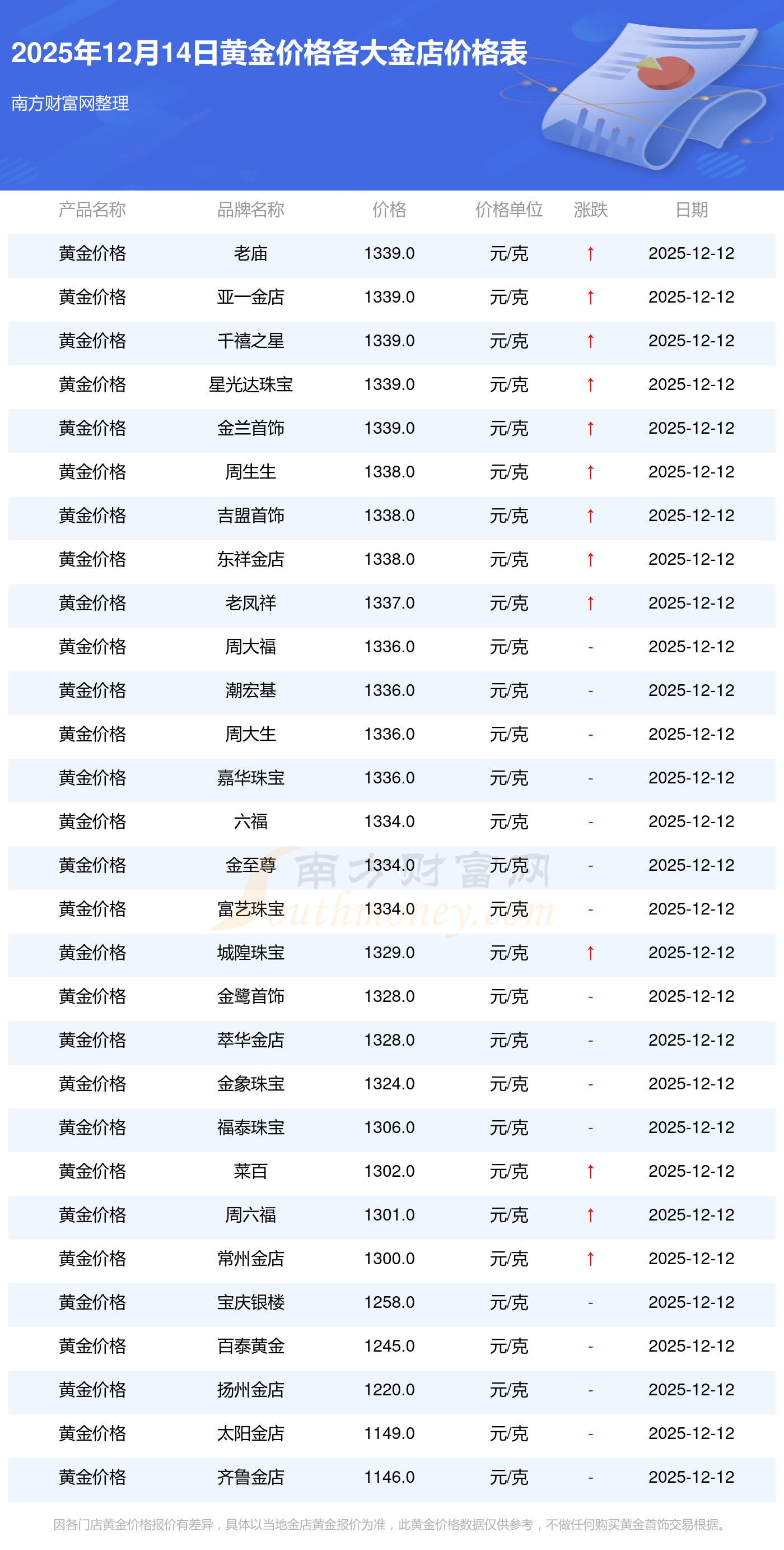 2025年12月14日,周大福、周大福、老凤祥、老凤祥、老庙、老庙、周生生、周生生、周大福、周大福、周大福等各大金店品牌黄金价格今日价格如下:周大福1336.0元/克、周大福681.0元/克、老凤祥1337.0元/克、老凤祥650.0元/克、老庙1339.0元/克、老庙600.0元/克、周生生1338.0元/克、周生生681.0元/克、周大福1336.0元/克、周大福47410.0、周大福19550.0。