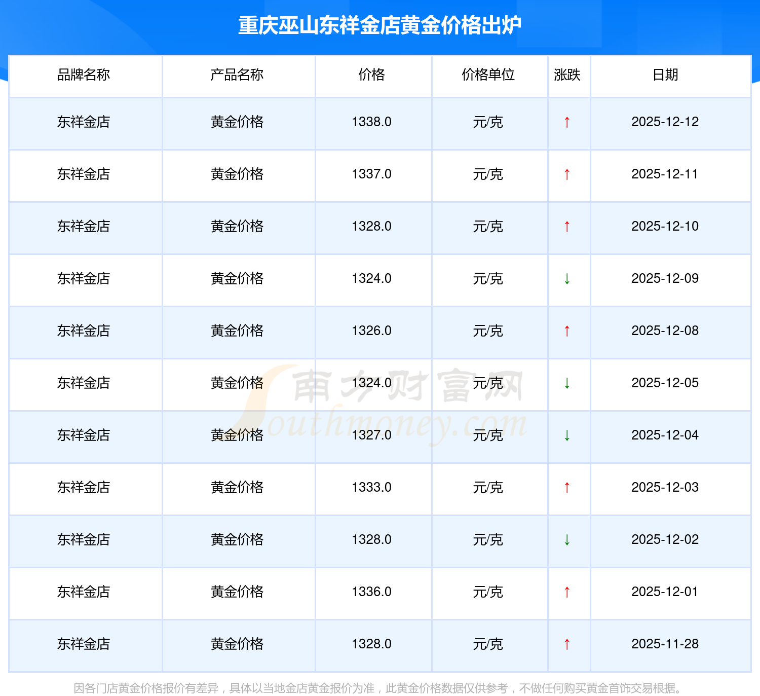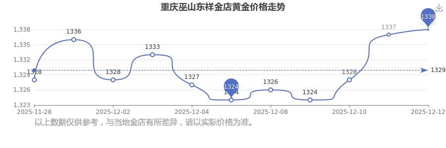 今日(2025年12月14日)重庆巫山东祥金店黄金价格最新价格为1338.0元/克。