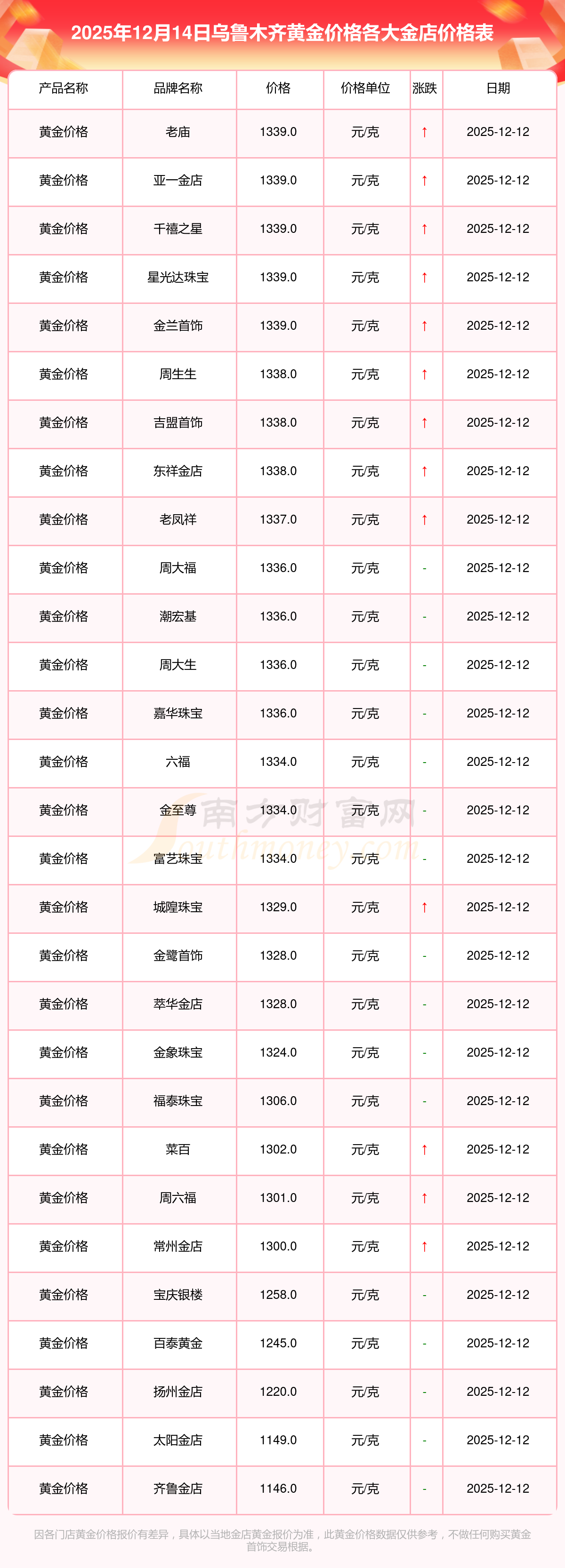 2025年12月14日乌鲁木齐各大金店黄金价格最新价格:周大福1336.0元/克,周大福681.0元/克,老凤祥1337.0元/克,老凤祥650.0元/克,老庙1339.0元/克,老庙600.0元/克,周生生1338.0元/克,周生生681.0元/克,周大福1336.0元/克,周大福47410.0,周大福19550.0。