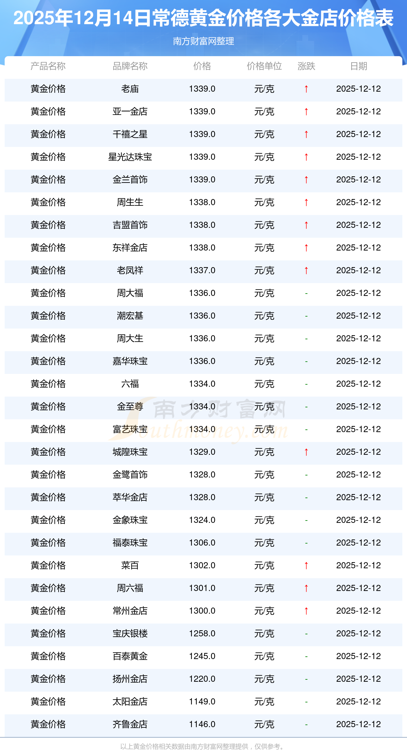 2025年12月14日常德周大福、周大福、老凤祥、老凤祥、老庙、老庙、周生生、周生生、周大福、周大福、周大福等各大金店品牌黄金价格最新价格行情来了,如下:周大福黄金价格1336.0元/克,周大福铂金价格681.0元/克,老凤祥黄金价格1337.0元/克,老凤祥铂金价格650.0元/克,老庙黄金价格1339.0元/克,老庙铂金价格600.0元/克,周生生黄金价格1338.0元/克,周生生铂金价格681.0元/克,周大福饰品金价(内地)1336.0元/克,周大福黄金饰品(香港)47410.0,周大福铂金价格(香港)19550.0。