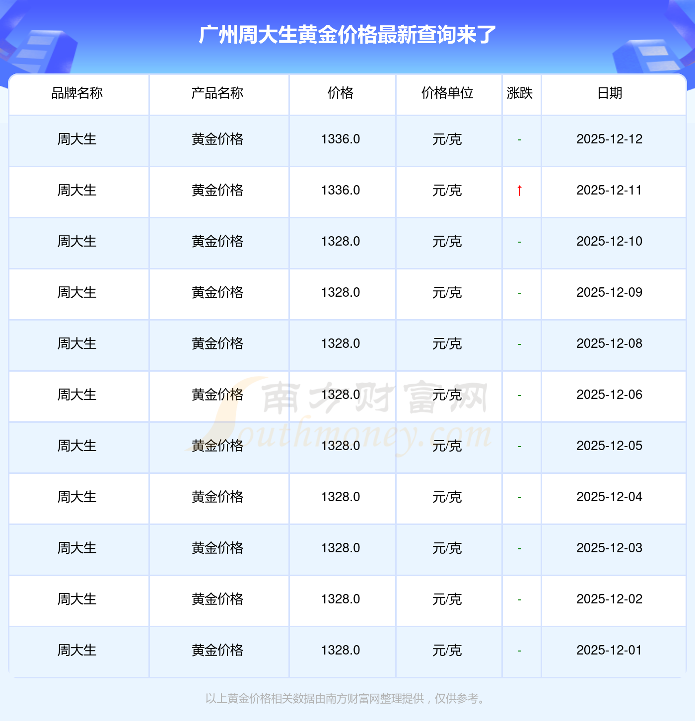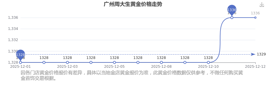 (2025年12月14日)广州周大生黄金价格现在为1336.0元/克。