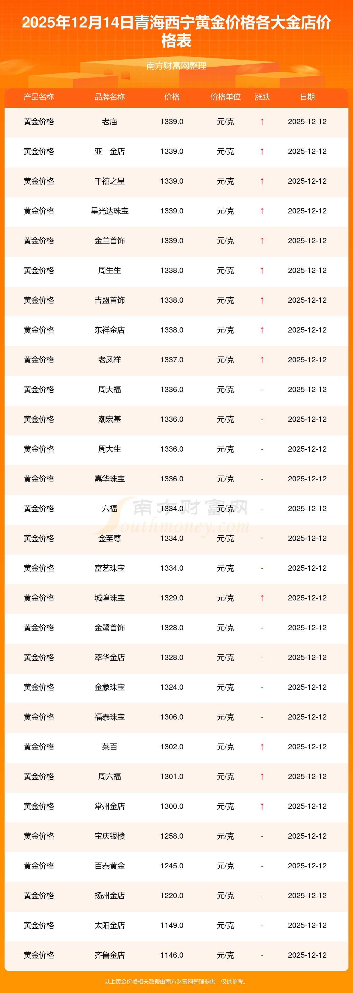目前,青海西宁黄金价格报价区间在1339.0元/克和1146.0元/克之间。最高的为老庙,报价1339.0元/克,最低的为齐鲁金店,报价1146.0元/克。今日黄金价格高低差为193元/克。