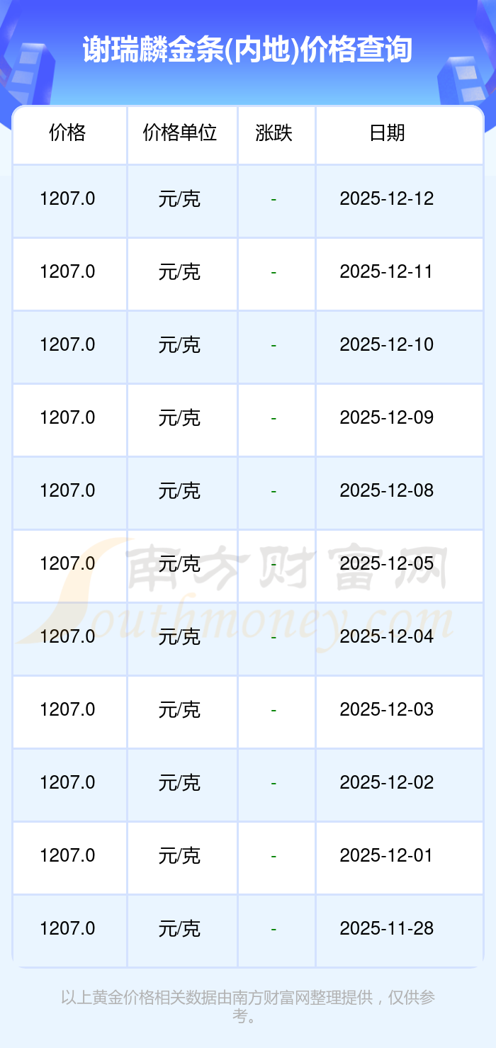 今日谢瑞麟金条(内地)价格为1207.0元/克。