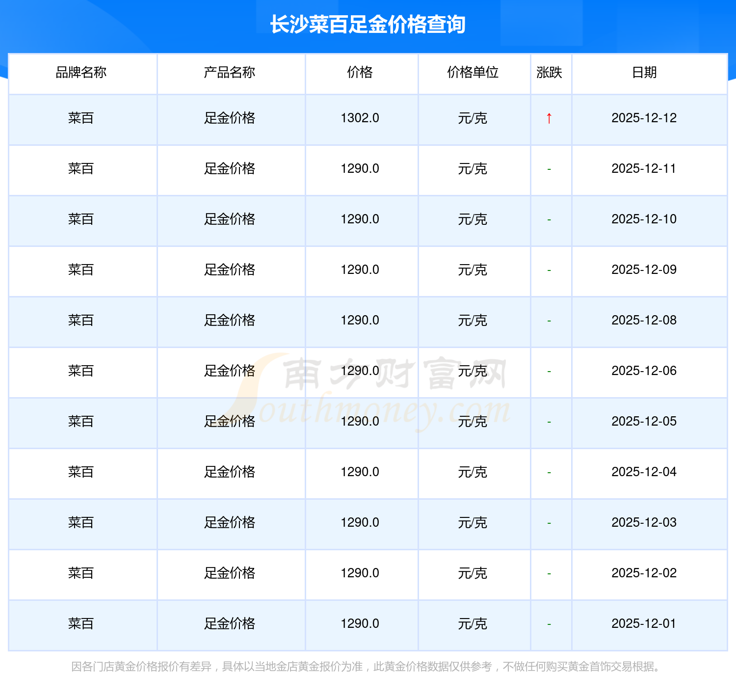 今日2025年12月14日,长沙菜百足金价格为1302.0元/克。