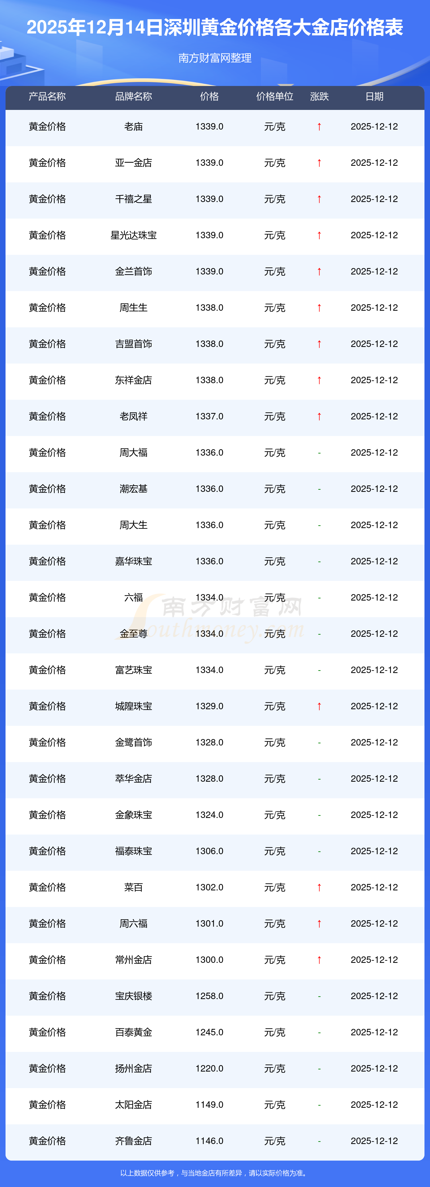 2025年12月14日深圳周大福、周大福、老凤祥、老凤祥、老庙、老庙、周生生、周生生、周大福、周大福、周大福等各大金店品牌黄金价格最新价格如下:周大福黄金价格1336.0元/克,周大福铂金价格681.0元/克,老凤祥黄金价格1337.0元/克,老凤祥铂金价格650.0元/克,老庙黄金价格1339.0元/克,老庙铂金价格600.0元/克,周生生黄金价格1338.0元/克,周生生铂金价格681.0元/克,周大福饰品金价(内地)1336.0元/克,周大福黄金饰品(香港)47410.0,周大福铂金价格(香港)19550.0。