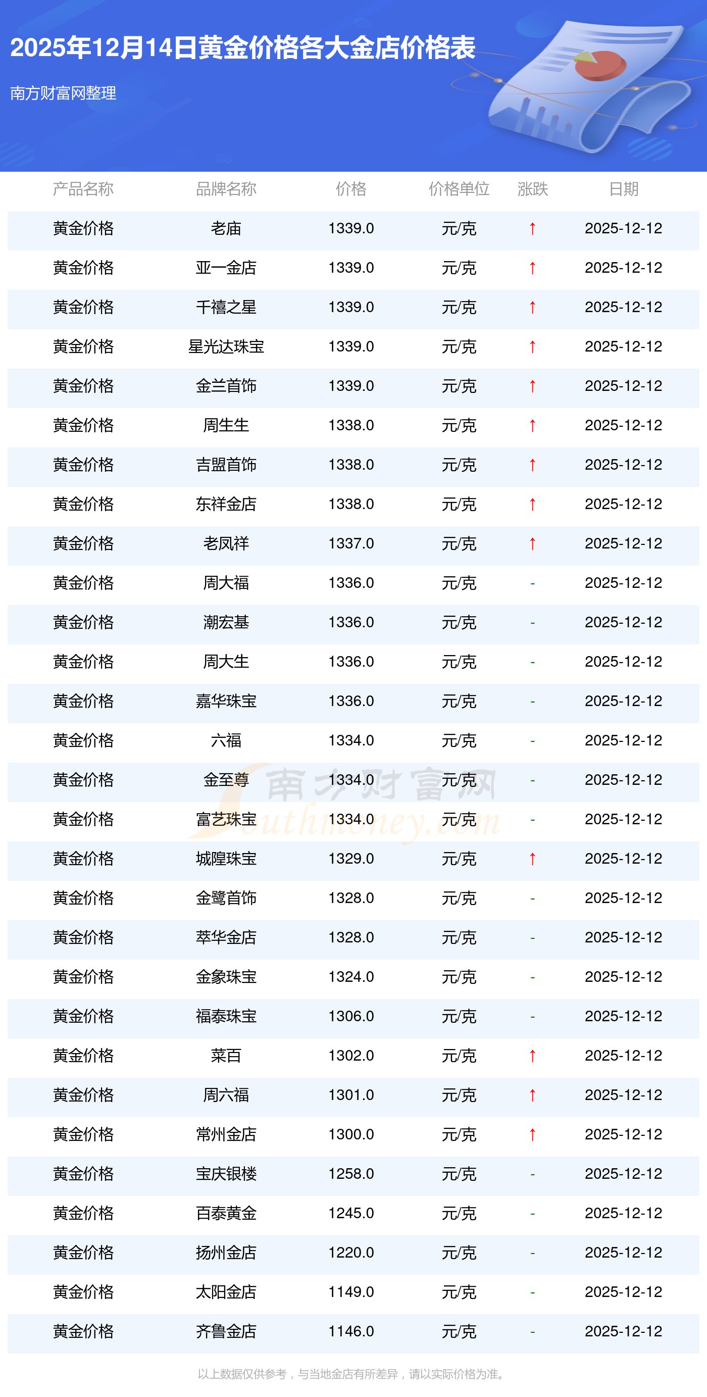 今天是2025年12月14日,周大福、周大福、老凤祥、老凤祥、老庙、老庙、周生生、周生生、周大福、周大福、周大福等各大金店品牌黄金价格最新价格如下:周大福1336.0元/克、周大福681.0元/克、老凤祥1337.0元/克、老凤祥650.0元/克、老庙1339.0元/克、老庙600.0元/克、周生生1338.0元/克、周生生681.0元/克、周大福1336.0元/克、周大福47410.0、周大福19550.0。