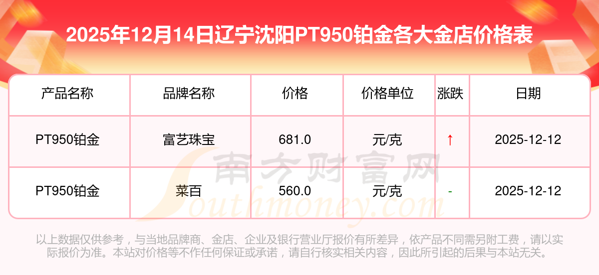 二、2025年12月14日今日辽宁沈阳各金店PT950铂金实时查询表