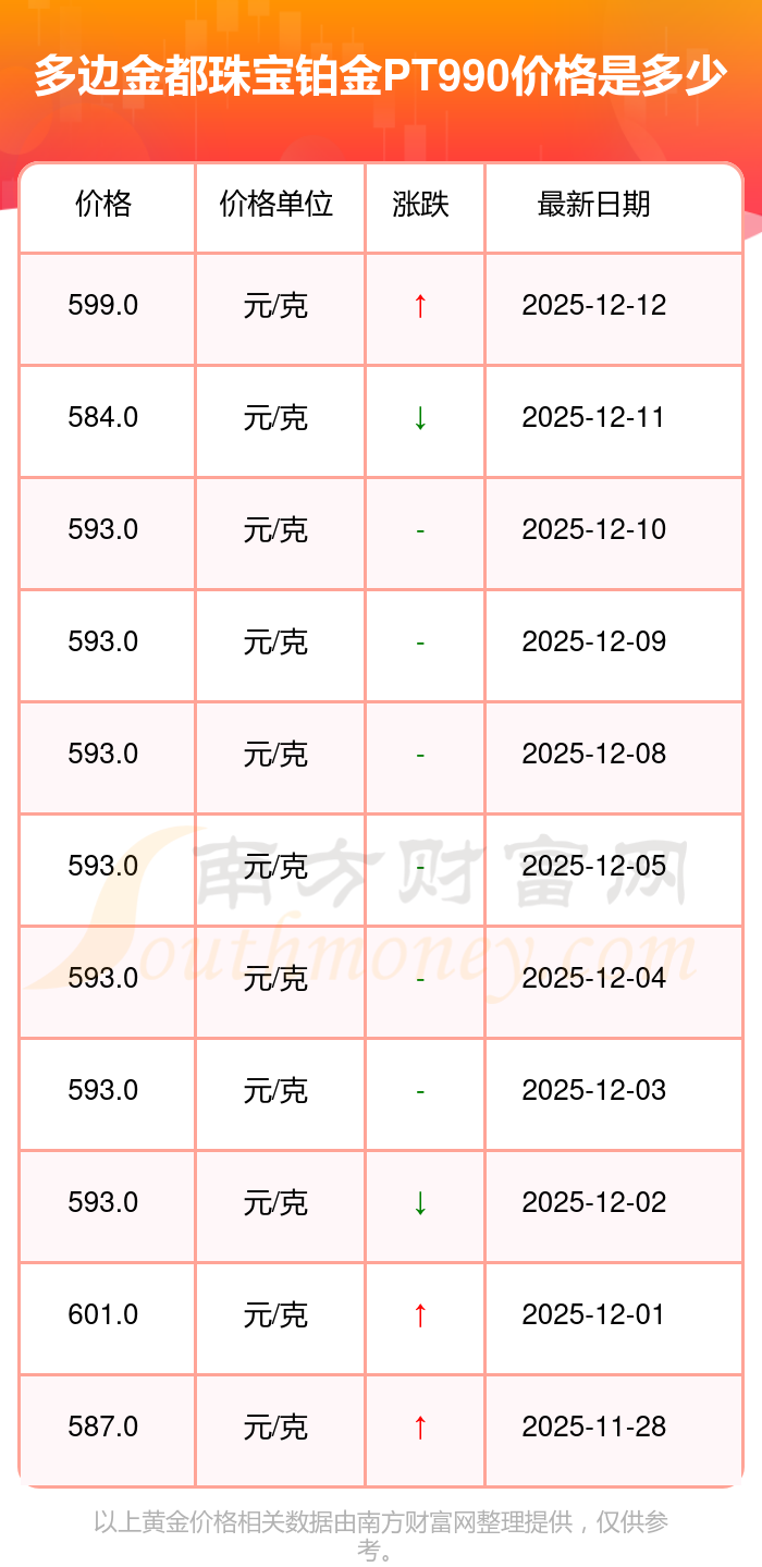 今日(2025年12月14日)多边金都珠宝铂金PT990的价格为599.0元/克。
