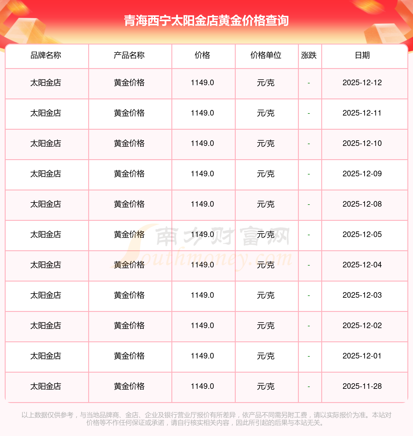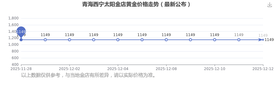 今日(2025年12月14日),青海西宁太阳金店黄金价格的定价为 1149.0元/克。