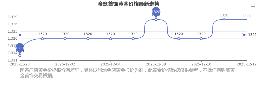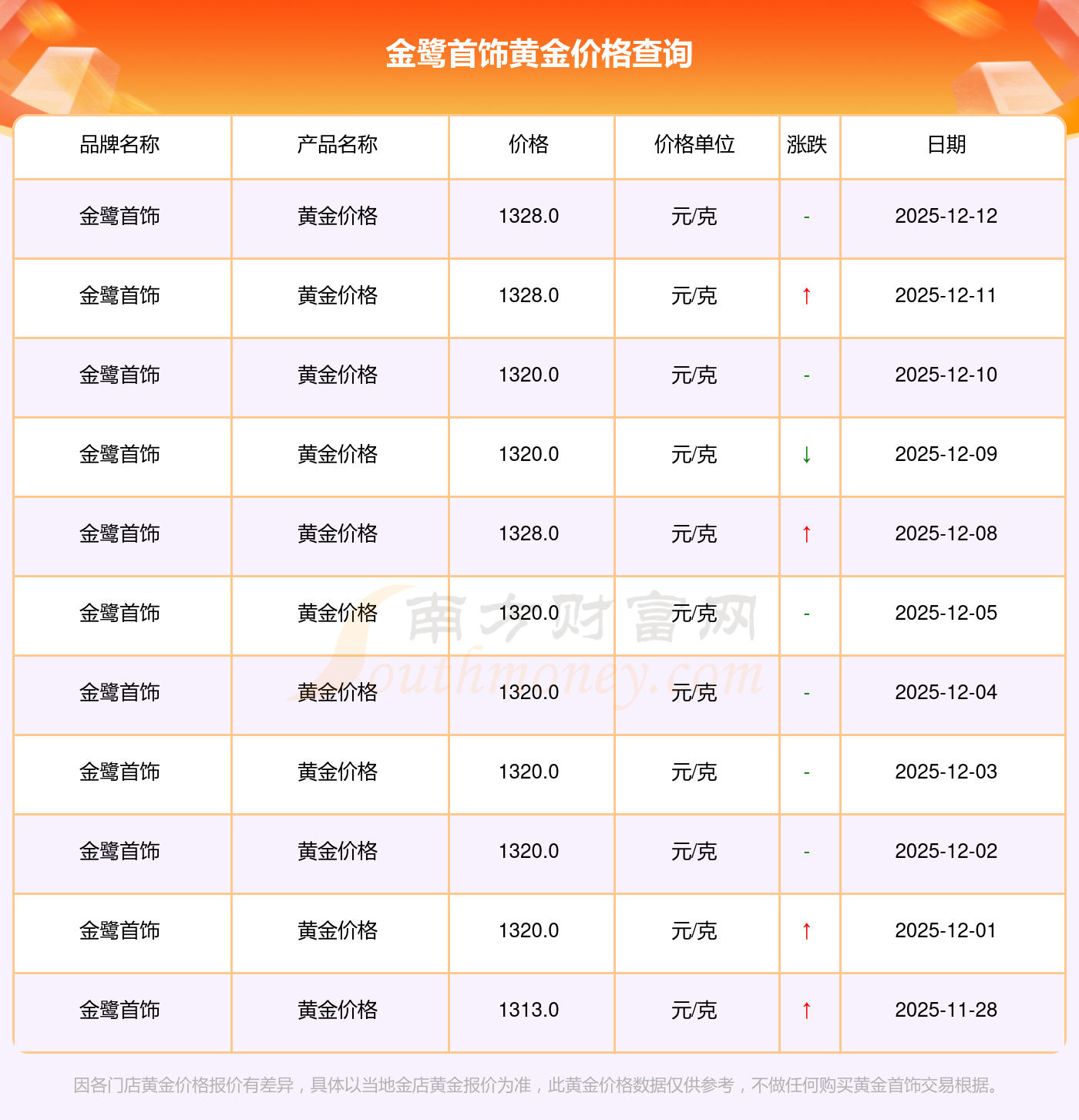 今日黄金价格具体多少?当下每克黄金值多少钱呢?黄金属于优良的导电导热材料,具有良好的导热特性。电子工业中的特殊电路设计常采用它,鉴于其化学稳定性高、抗氧化性强,能够制作高精度电子元件。2025年12月14日金鹭首饰黄金价格为1328.0元/克。