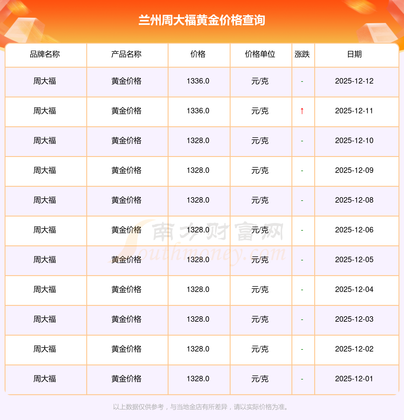 2025年12月14日,兰州周大福黄金价格每克的售卖价位为1336.0元/克。