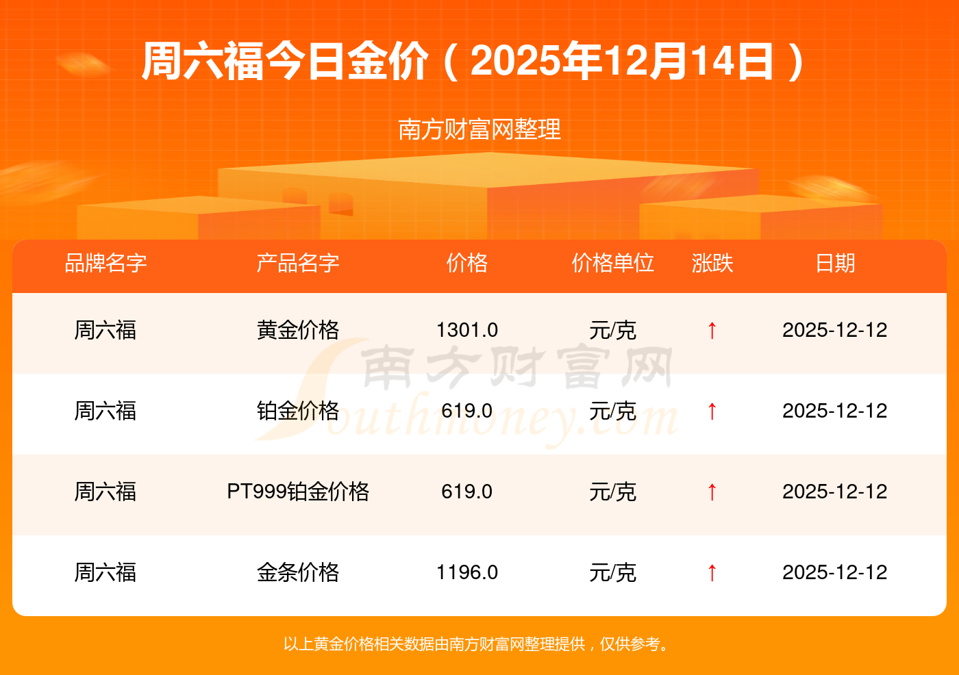 2025年12月14日周六福最新价格:黄金价格1336.0元/克,铂金价格681.0元/克,黄金价格1337.0元/克,铂金价格650.0元/克,黄金价格1339.0元/克,铂金价格600.0元/克,黄金价格1338.0元/克,铂金价格681.0元/克,饰品金价(内地)1336.0元/克,黄金饰品(香港)47410.0,铂金价格(香港)19550.0。