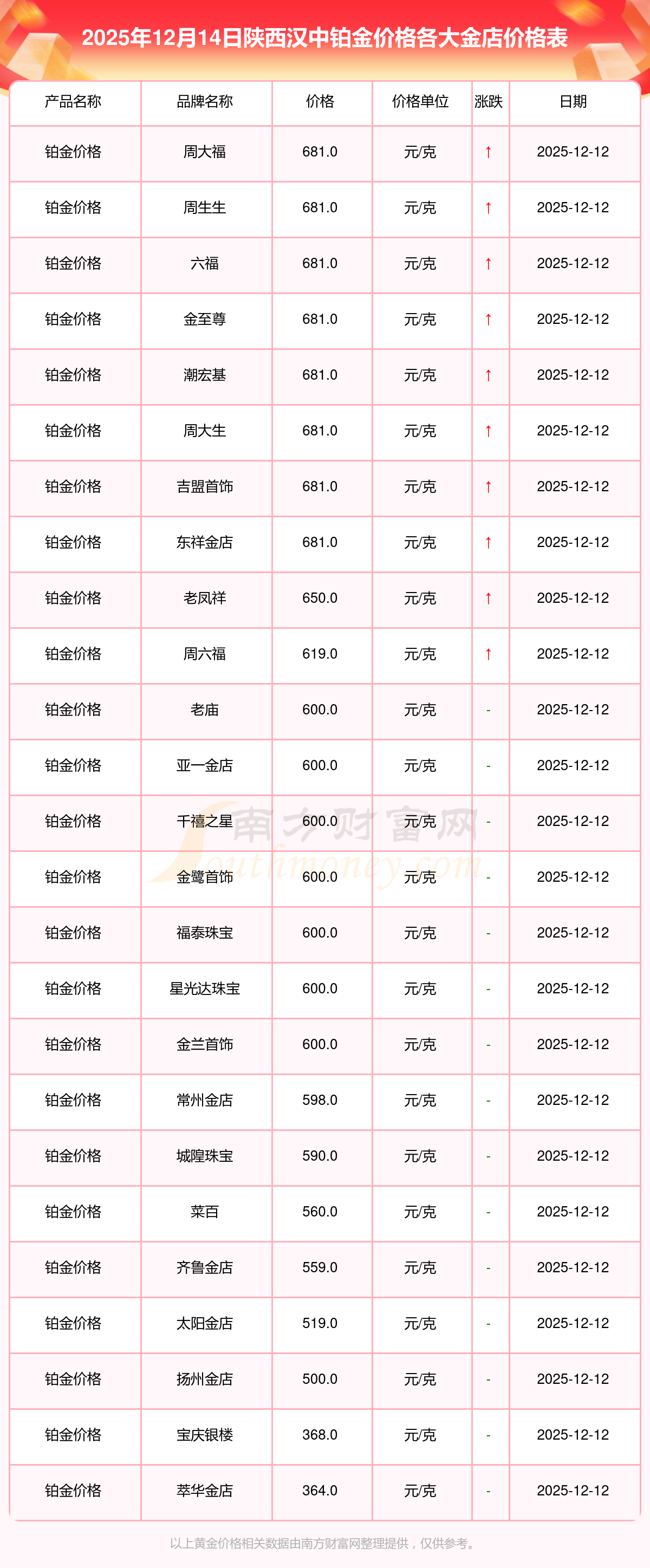 2025年12月14日陕西汉中各大金店铂金价格最新价格:周大福1336.0元/克,周大福681.0元/克,老凤祥1337.0元/克,老凤祥650.0元/克,老庙1339.0元/克,老庙600.0元/克,周生生1338.0元/克,周生生681.0元/克,周大福1336.0元/克,周大福47410.0,周大福19550.0。