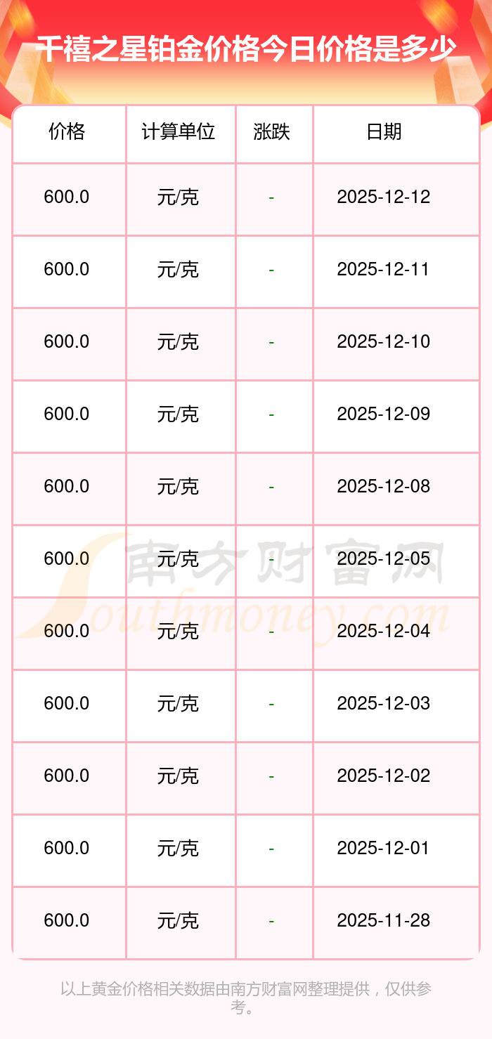 千禧之星 铂金价格在今日更新至600.0元/克。