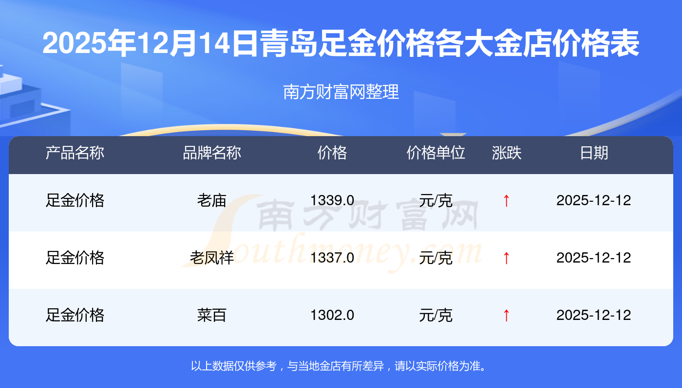 2025年12月14日青岛各大金店足金价格最新价格查询来了:周大福1336.0元/克,周大福681.0元/克,老凤祥1337.0元/克,老凤祥650.0元/克,老庙1339.0元/克,老庙600.0元/克,周生生1338.0元/克,周生生681.0元/克,周大福1336.0元/克,周大福47410.0,周大福19550.0。