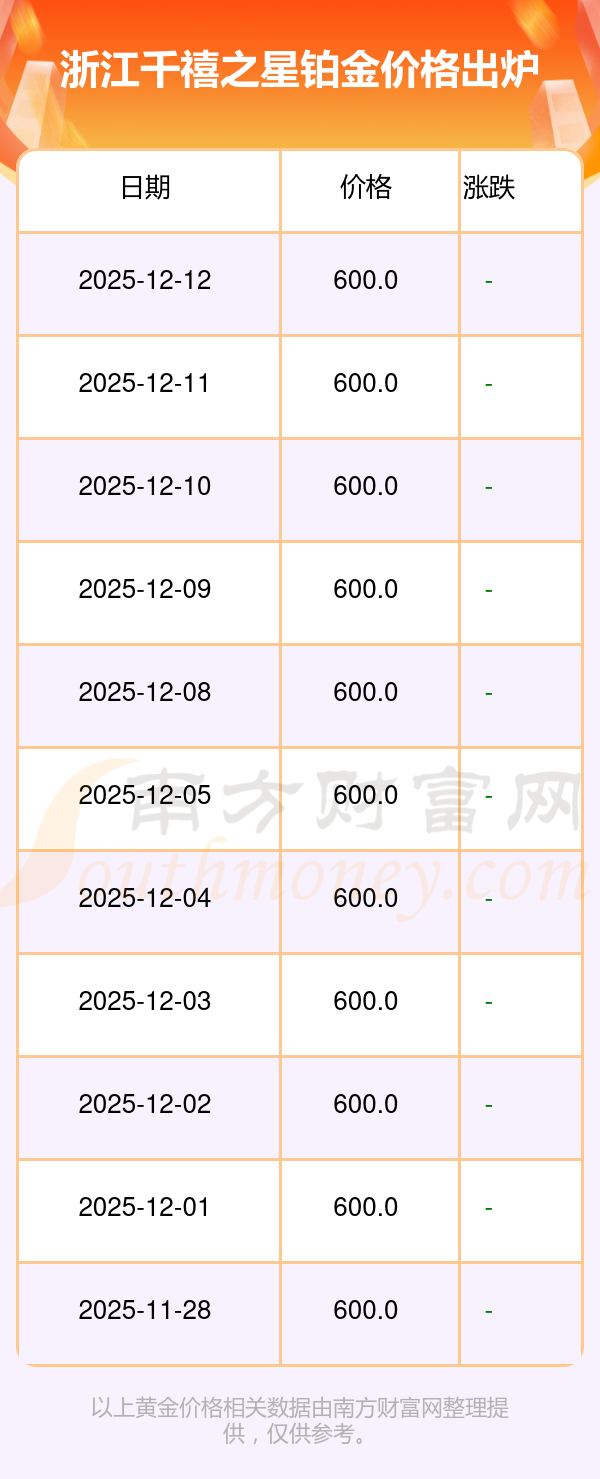 2025年12月14日,浙江千禧之星铂金价格每克的售卖价位为600.0元/克。