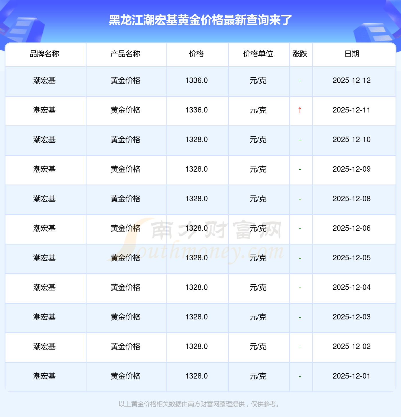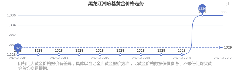 2025年12月14日黑龙江潮宏基黄金价格为1336.0元/克。