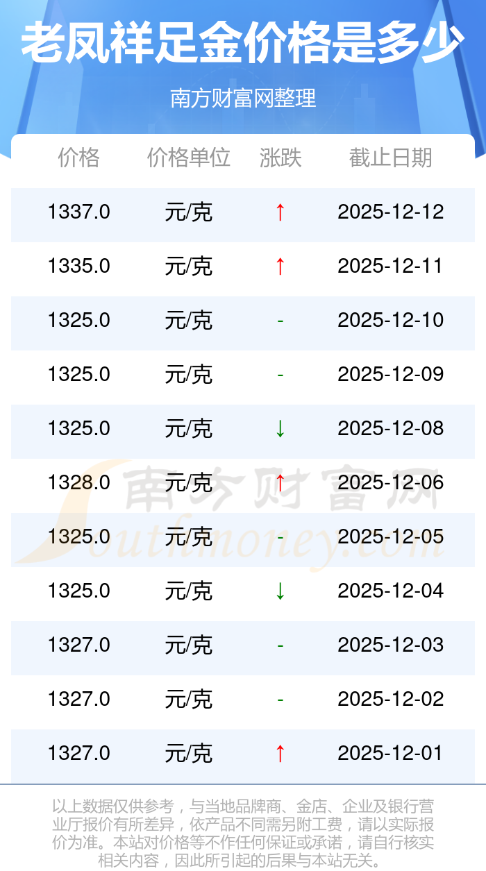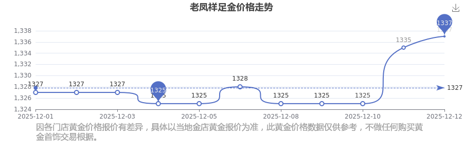 最新数据表明,老凤祥今日 足金价格为1337.0元/克。