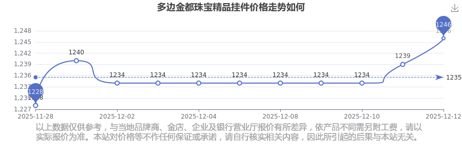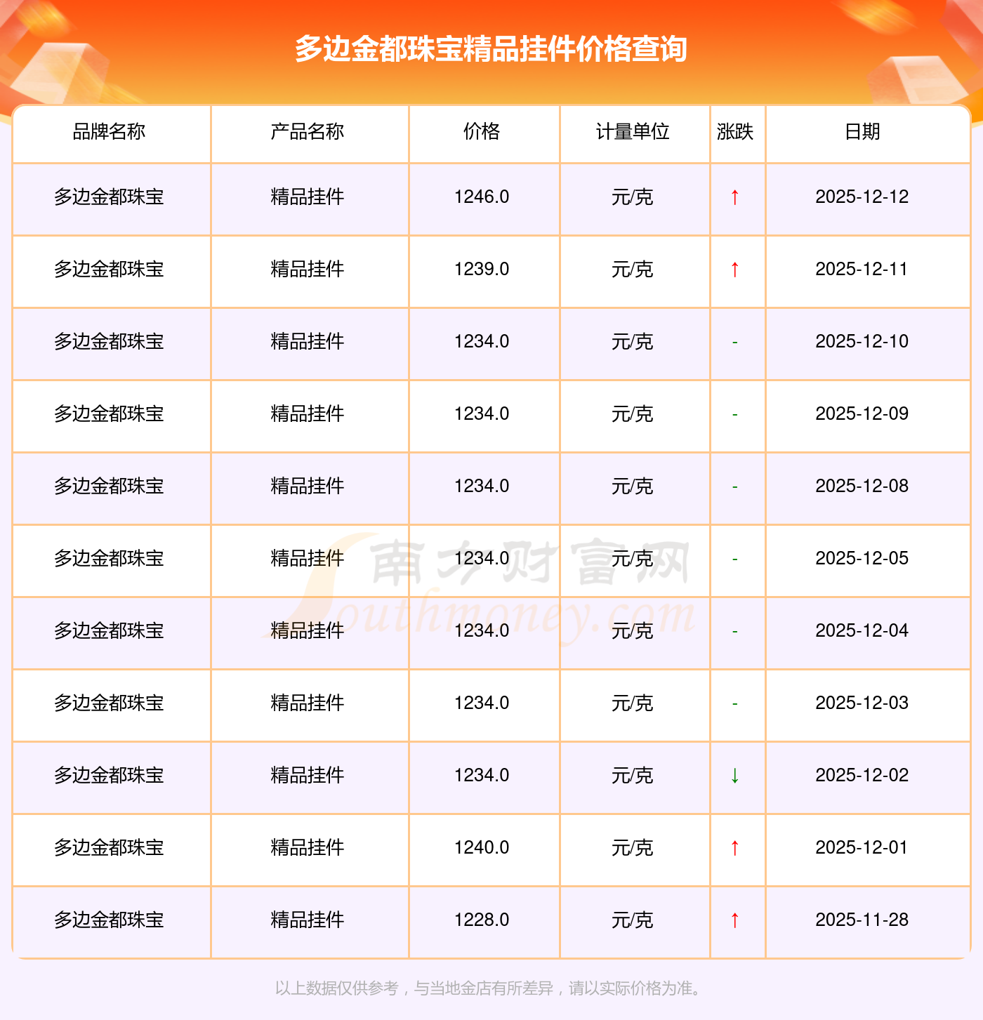 今日(2025年12月14日),多边金都珠宝精品挂件最新价格为1246.0元/克。