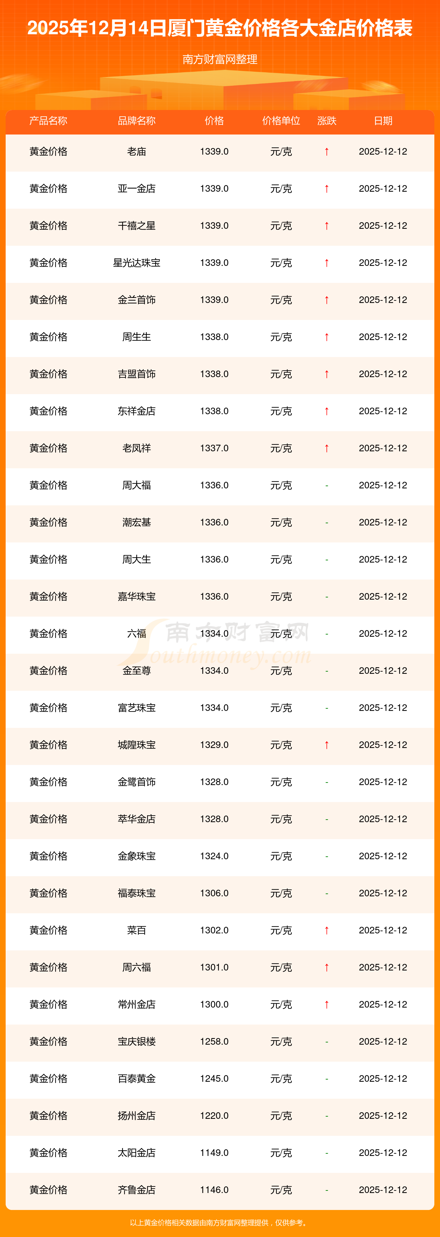 2025年12月14日厦门周大福、周大福、老凤祥、老凤祥、老庙、老庙、周生生、周生生、周大福、周大福、周大福等各大金店品牌黄金价格最新价格行情来了,如下:周大福黄金价格1336.0元/克,周大福铂金价格681.0元/克,老凤祥黄金价格1337.0元/克,老凤祥铂金价格650.0元/克,老庙黄金价格1339.0元/克,老庙铂金价格600.0元/克,周生生黄金价格1338.0元/克,周生生铂金价格681.0元/克,周大福饰品金价(内地)1336.0元/克,周大福黄金饰品(香港)47410.0,周大福铂金价格(香港)19550.0。