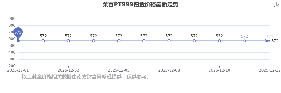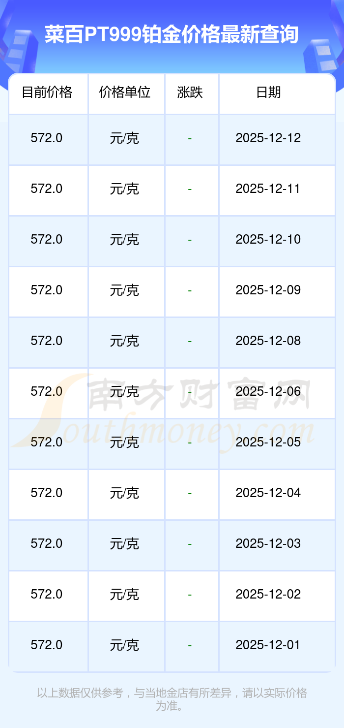 今日菜百PT999铂金价格最新为572.0元/克。