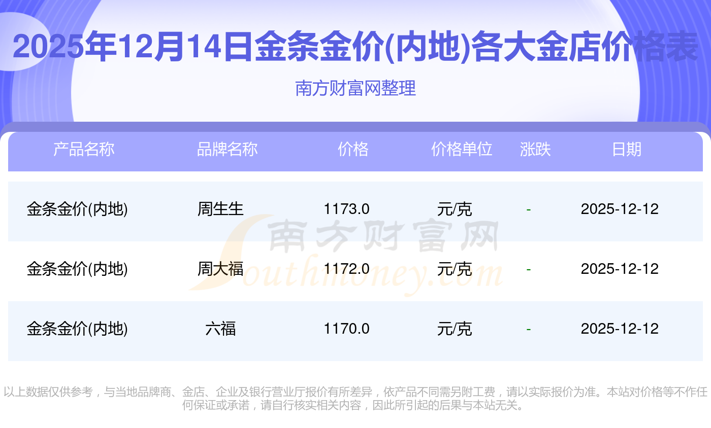 2025年12月14日周大福、周大福、老凤祥、老凤祥、老庙、老庙、周生生、周生生、周大福、周大福、周大福等各大金店品牌金条金价(内地)最新价格如下:周大福黄金价格1336.0元/克,周大福铂金价格681.0元/克,老凤祥黄金价格1337.0元/克,老凤祥铂金价格650.0元/克,老庙黄金价格1339.0元/克,老庙铂金价格600.0元/克,周生生黄金价格1338.0元/克,周生生铂金价格681.0元/克,周大福饰品金价(内地)1336.0元/克,周大福黄金饰品(香港)47410.0,周大福铂金价格(香港)19550.0。