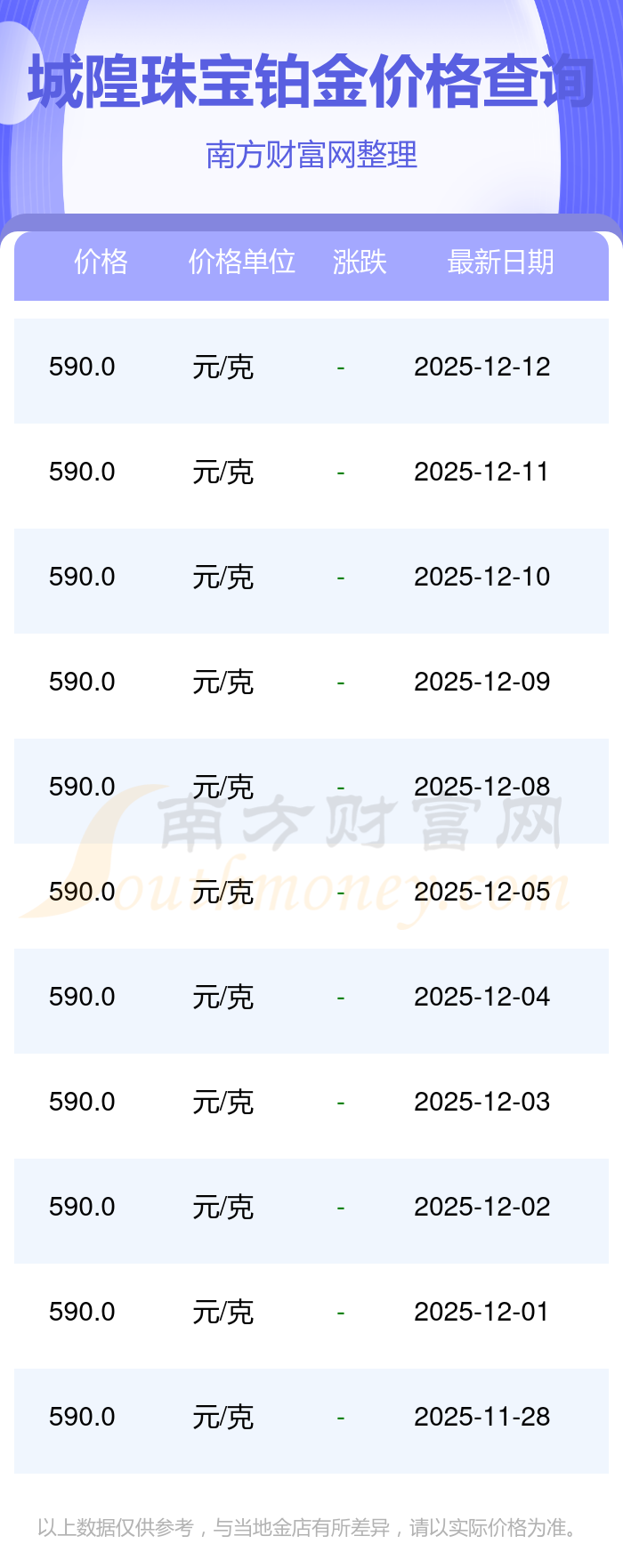 今日(2025年12月14日),城隍珠宝铂金价格:590.0元/克。