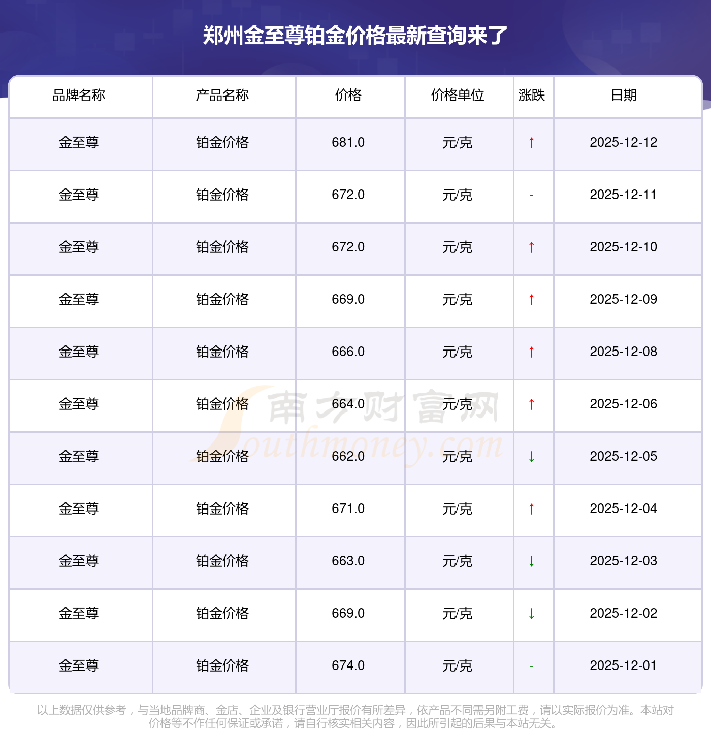 今日郑州金至尊铂金价格最新价格是681.0元/克。