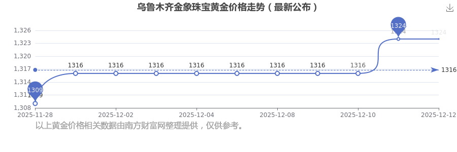 今日(2025年12月14日),乌鲁木齐金象珠宝黄金价格的价格是1324.0元/克。