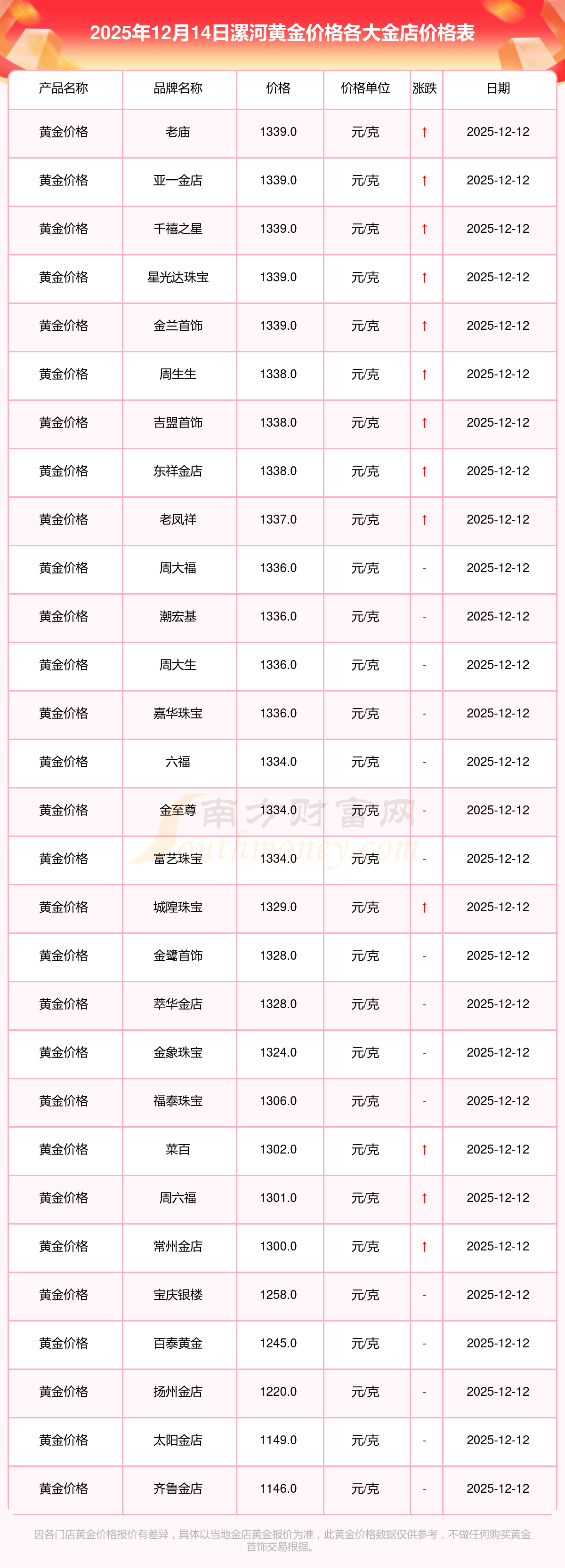 2025年12月14日漯河周大福、周大福、老凤祥、老凤祥、老庙、老庙、周生生、周生生、周大福、周大福、周大福等各大金店品牌黄金价格最新价格如下:周大福黄金价格1336.0元/克,周大福铂金价格681.0元/克,老凤祥黄金价格1337.0元/克,老凤祥铂金价格650.0元/克,老庙黄金价格1339.0元/克,老庙铂金价格600.0元/克,周生生黄金价格1338.0元/克,周生生铂金价格681.0元/克,周大福饰品金价(内地)1336.0元/克,周大福黄金饰品(香港)47410.0,周大福铂金价格(香港)19550.0。