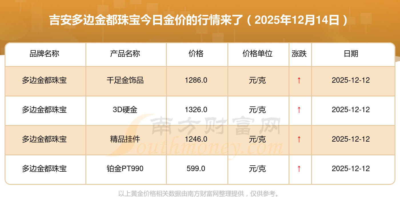 2025年12月14日吉安多边金都珠宝黄金一克的市场行情价是多少?黄金价格1336.0元/克,铂金价格681.0元/克,黄金价格1337.0元/克,铂金价格650.0元/克,黄金价格1339.0元/克,铂金价格600.0元/克,黄金价格1338.0元/克,铂金价格681.0元/克,饰品金价(内地)1336.0元/克,黄金饰品(香港)47410.0,铂金价格(香港)19550.0。