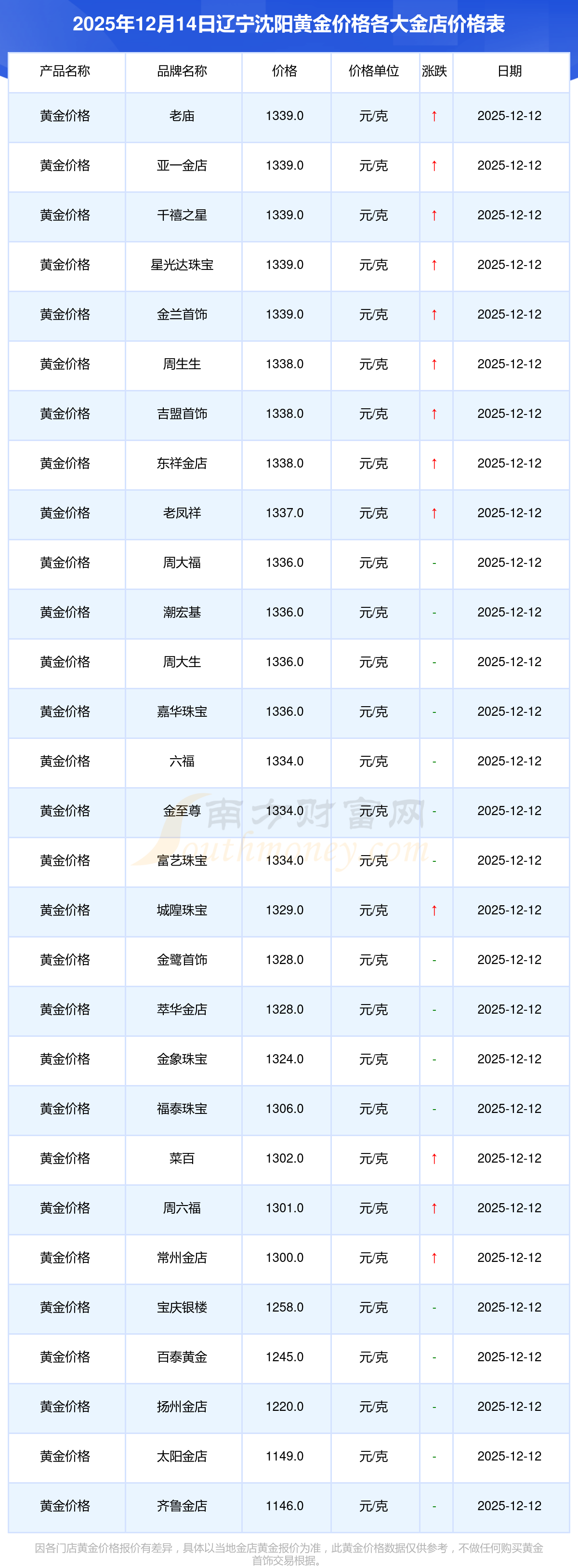 2025年12月14日辽宁沈阳周大福、周大福、老凤祥、老凤祥、老庙、老庙、周生生、周生生、周大福、周大福、周大福等各大金店品牌黄金价格最新价格如下:周大福黄金价格1336.0元/克,周大福铂金价格681.0元/克,老凤祥黄金价格1337.0元/克,老凤祥铂金价格650.0元/克,老庙黄金价格1339.0元/克,老庙铂金价格600.0元/克,周生生黄金价格1338.0元/克,周生生铂金价格681.0元/克,周大福饰品金价(内地)1336.0元/克,周大福黄金饰品(香港)47410.0,周大福铂金价格(香港)19550.0。