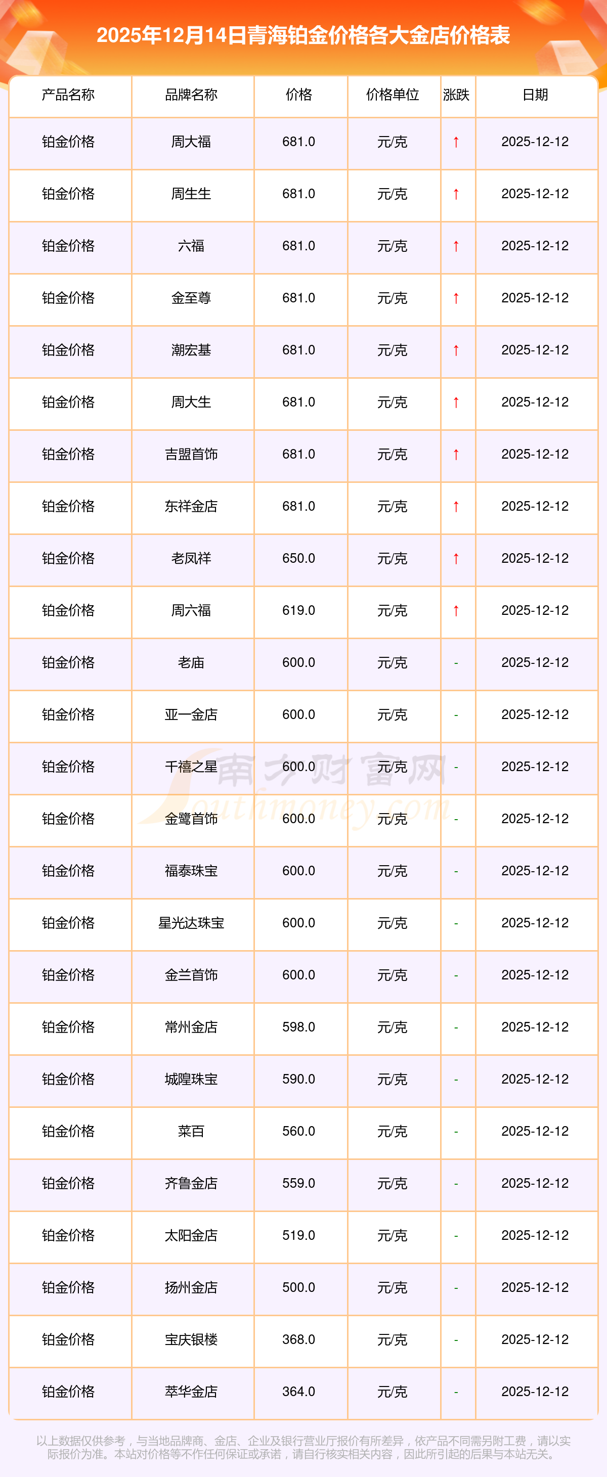 2025年12月14日,青海周大福、周大福、老凤祥、老凤祥、老庙、老庙、周生生、周生生、周大福、周大福、周大福等各大金店品牌铂金价格今日价格如下:周大福1336.0元/克、周大福681.0元/克、老凤祥1337.0元/克、老凤祥650.0元/克、老庙1339.0元/克、老庙600.0元/克、周生生1338.0元/克、周生生681.0元/克、周大福1336.0元/克、周大福47410.0、周大福19550.0。