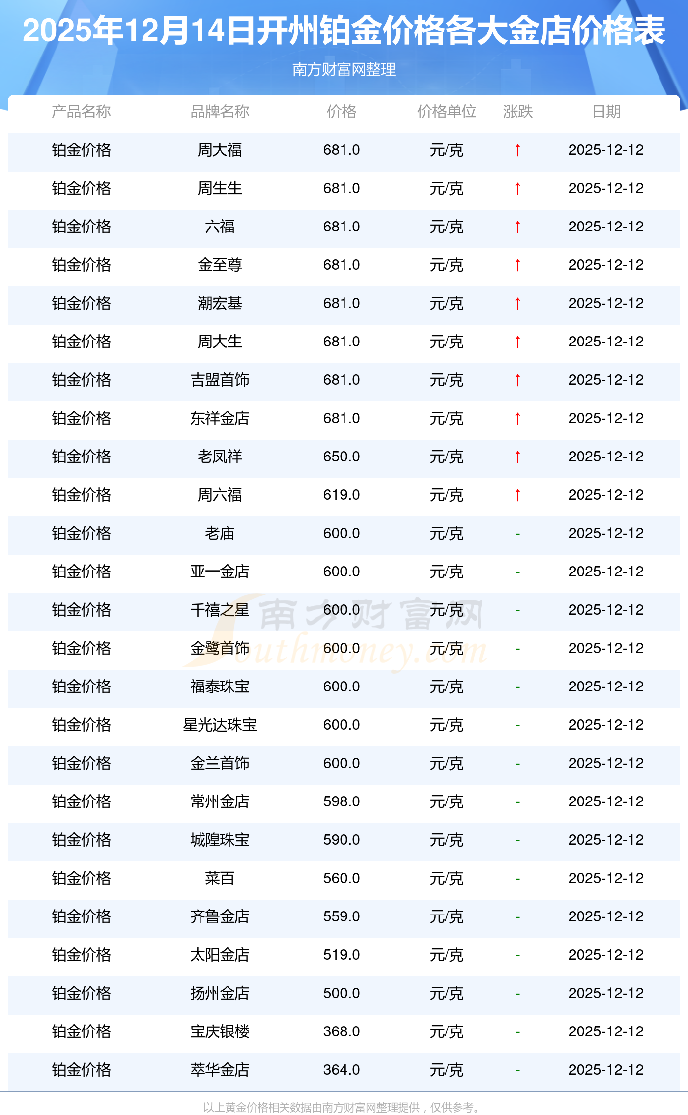 2025年12月14日开州周大福、周大福、老凤祥、老凤祥、老庙、老庙、周生生、周生生、周大福、周大福、周大福等各大金店品牌铂金价格最新价格如下:周大福黄金价格1336.0元/克,周大福铂金价格681.0元/克,老凤祥黄金价格1337.0元/克,老凤祥铂金价格650.0元/克,老庙黄金价格1339.0元/克,老庙铂金价格600.0元/克,周生生黄金价格1338.0元/克,周生生铂金价格681.0元/克,周大福饰品金价(内地)1336.0元/克,周大福黄金饰品(香港)47410.0,周大福铂金价格(香港)19550.0。