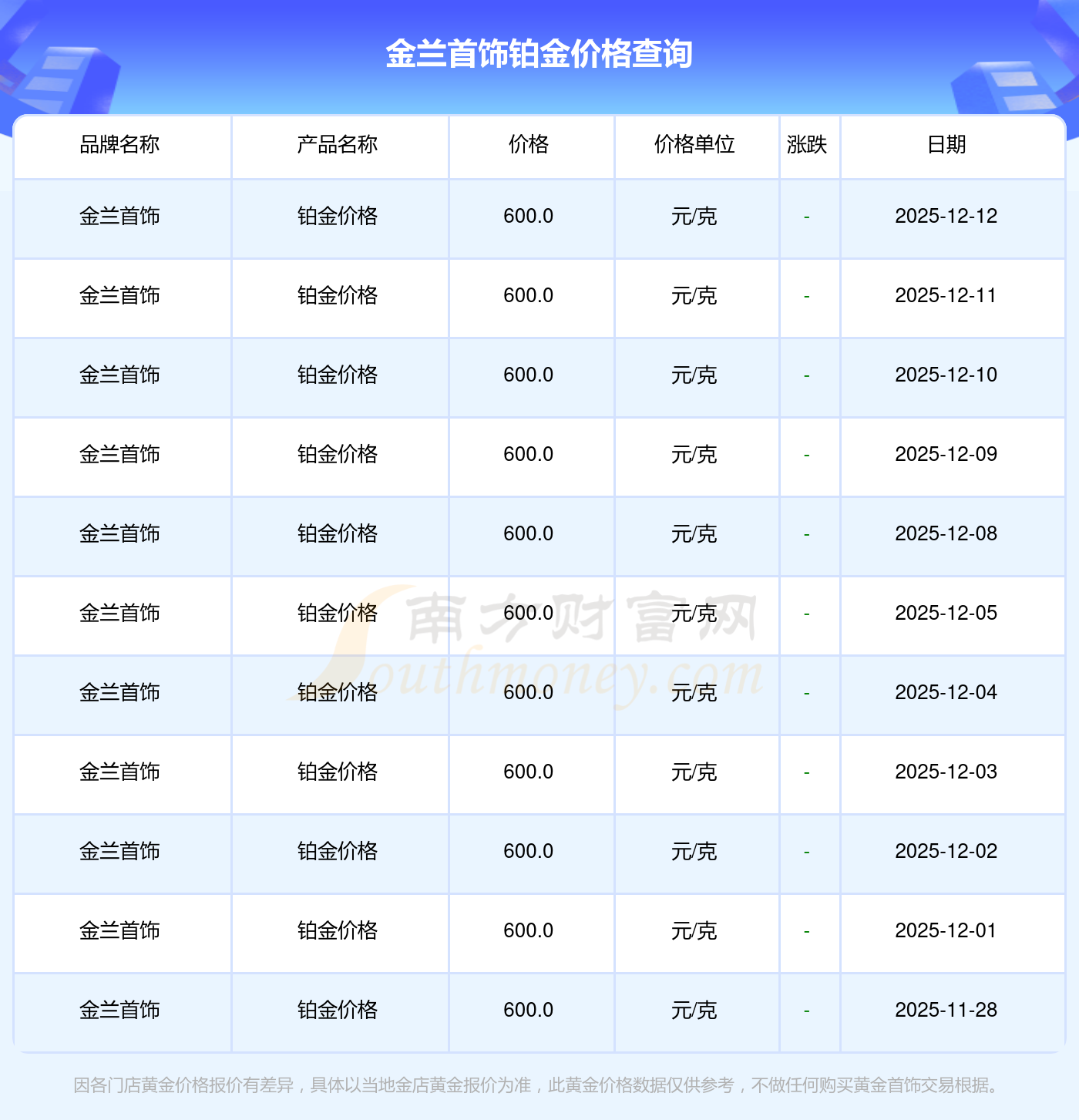 今日金兰首饰 铂金价格的最新定价为600.0元/克。