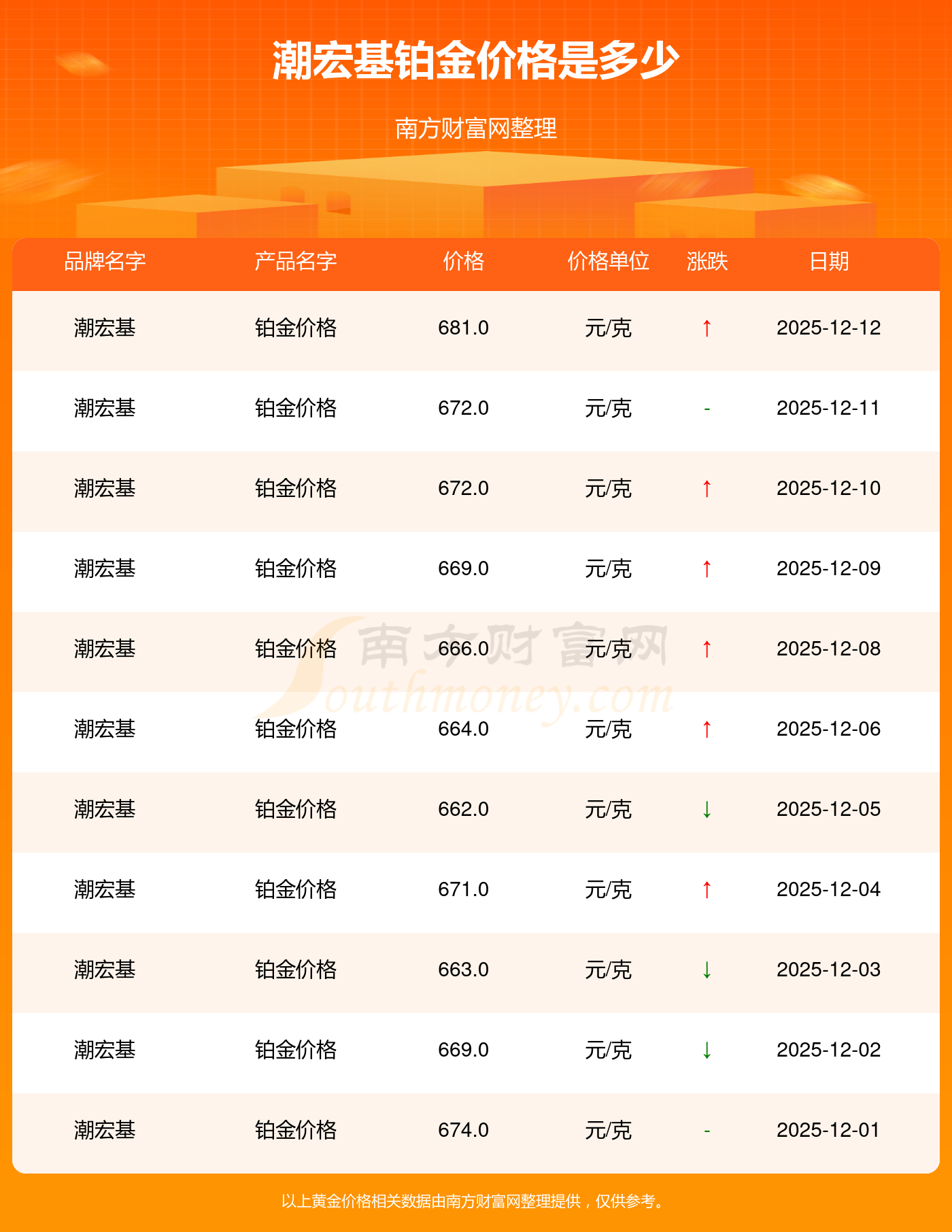 最新数据表明,潮宏基今日 铂金价格为681.0元/克。