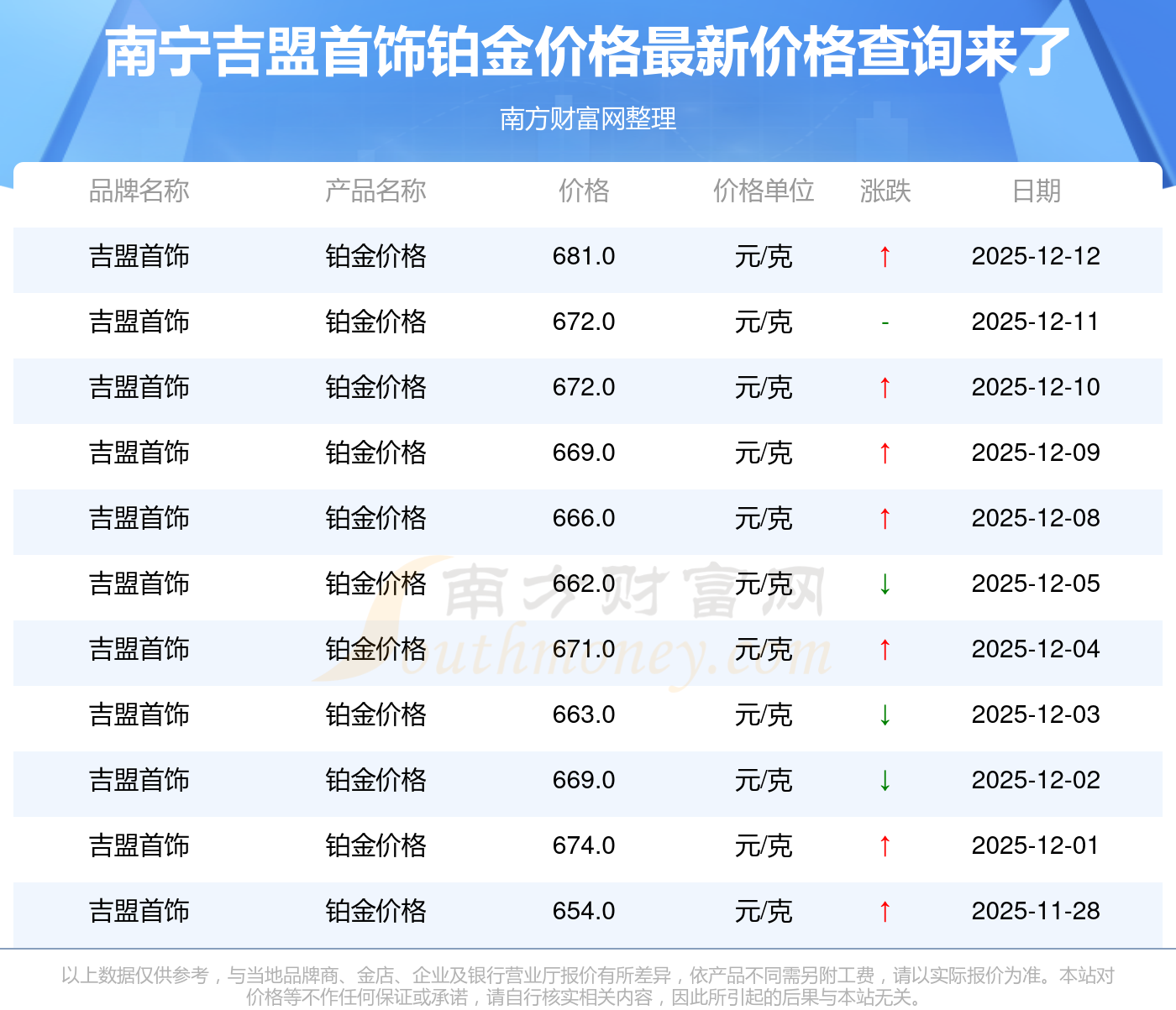 今日南宁吉盟首饰铂金价格的价格为681.0元/克。