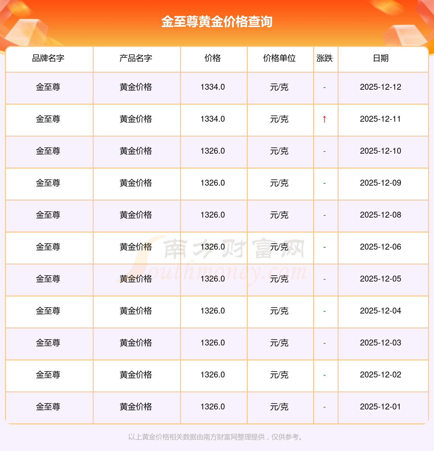 今日黄金售价是多少呢?此刻每克黄金价钱怎样?黄金每克的价钱通常来说是多少左右?今日(2025年12月14日)金至尊黄金价格:1334.0元/克。