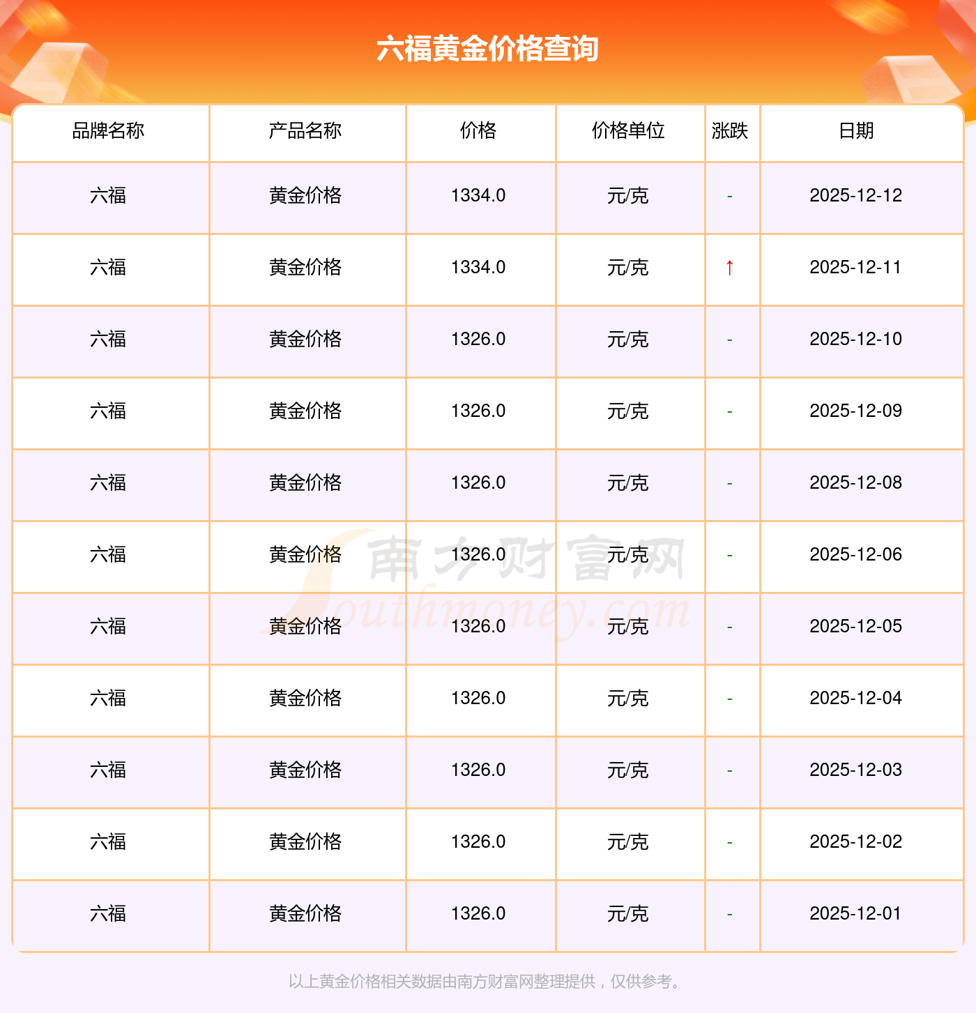今日六福 黄金价格的最新定价为1334.0元/克。