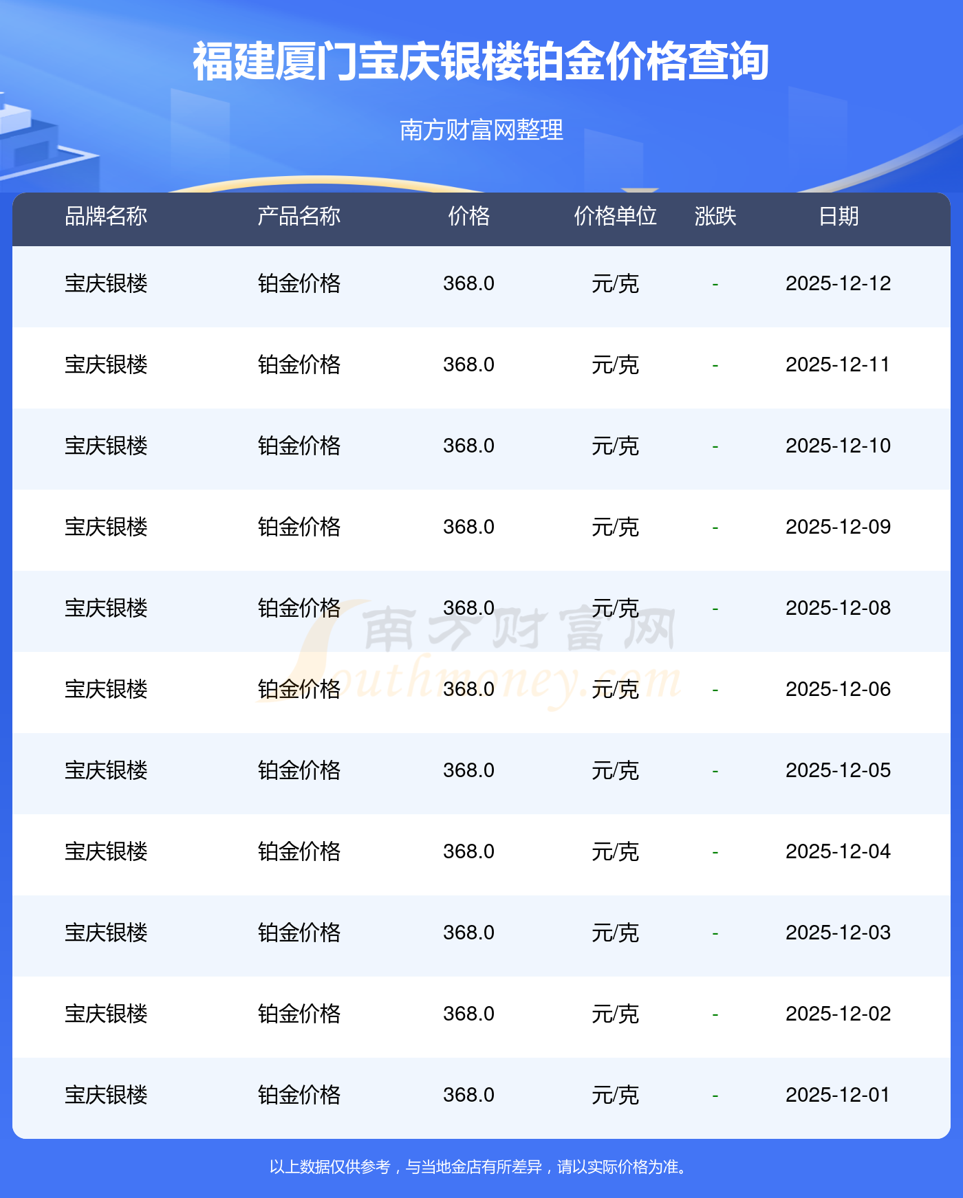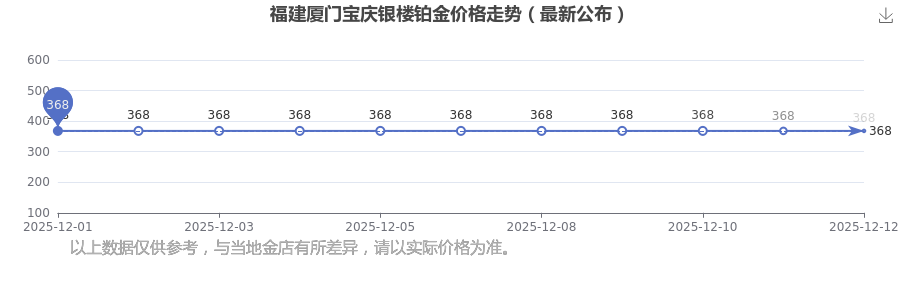 今日(2025年12月14日),福建厦门宝庆银楼铂金价格:368.0元/克。