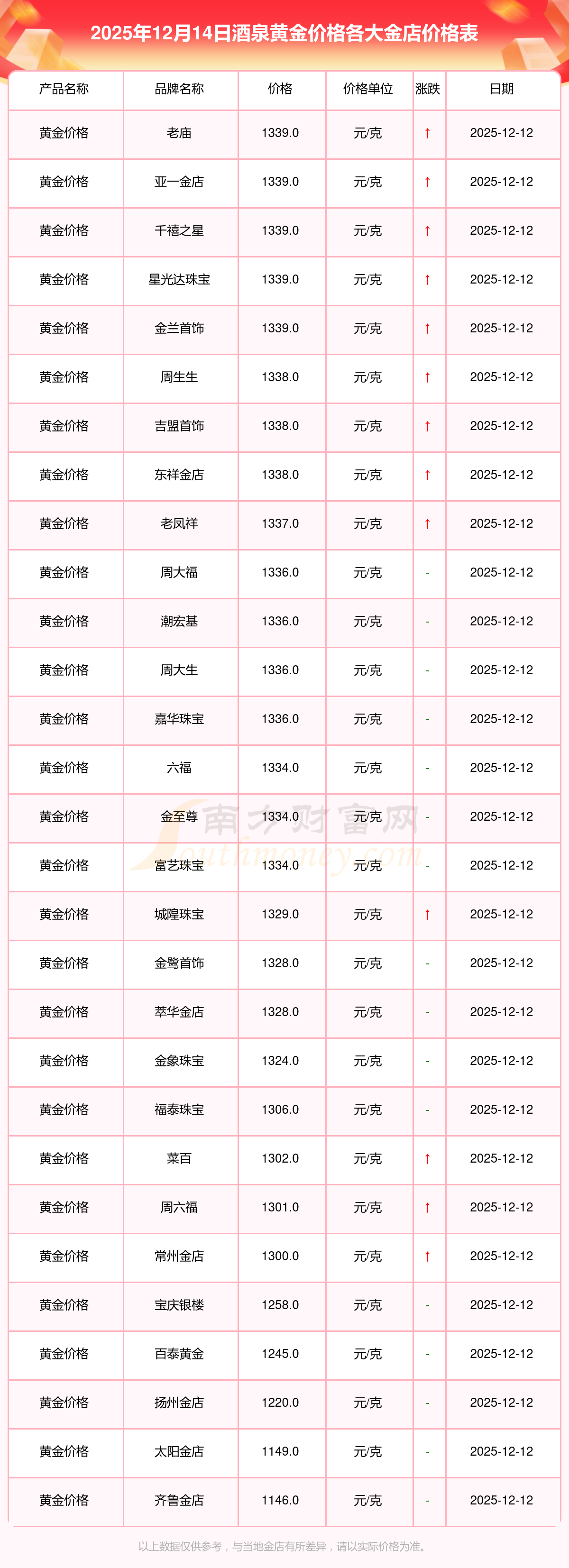 今天是2025年12月14日,酒泉周大福、周大福、老凤祥、老凤祥、老庙、老庙、周生生、周生生、周大福、周大福、周大福等各大金店品牌黄金价格最新价格如下:周大福1336.0元/克、周大福681.0元/克、老凤祥1337.0元/克、老凤祥650.0元/克、老庙1339.0元/克、老庙600.0元/克、周生生1338.0元/克、周生生681.0元/克、周大福1336.0元/克、周大福47410.0、周大福19550.0。