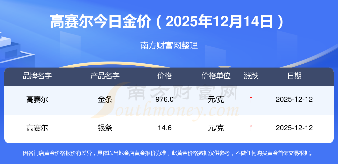 2025年12月14日高赛尔金价查询:黄金价格1336.0元/克,铂金价格681.0元/克,黄金价格1337.0元/克,铂金价格650.0元/克,黄金价格1339.0元/克,铂金价格600.0元/克,黄金价格1338.0元/克,铂金价格681.0元/克,饰品金价(内地)1336.0元/克,黄金饰品(香港)47410.0,铂金价格(香港)19550.0。