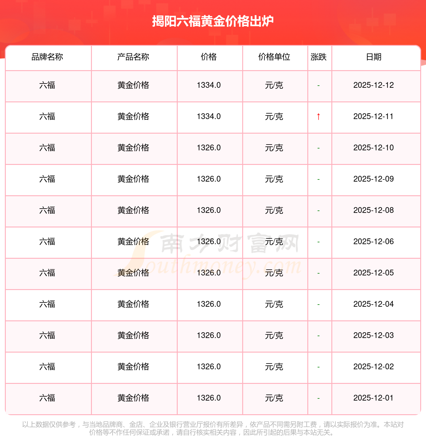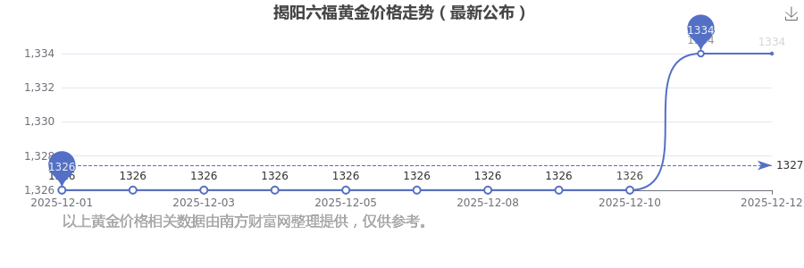 2025年12月14日揭阳六福黄金价格:1334.0元/克。